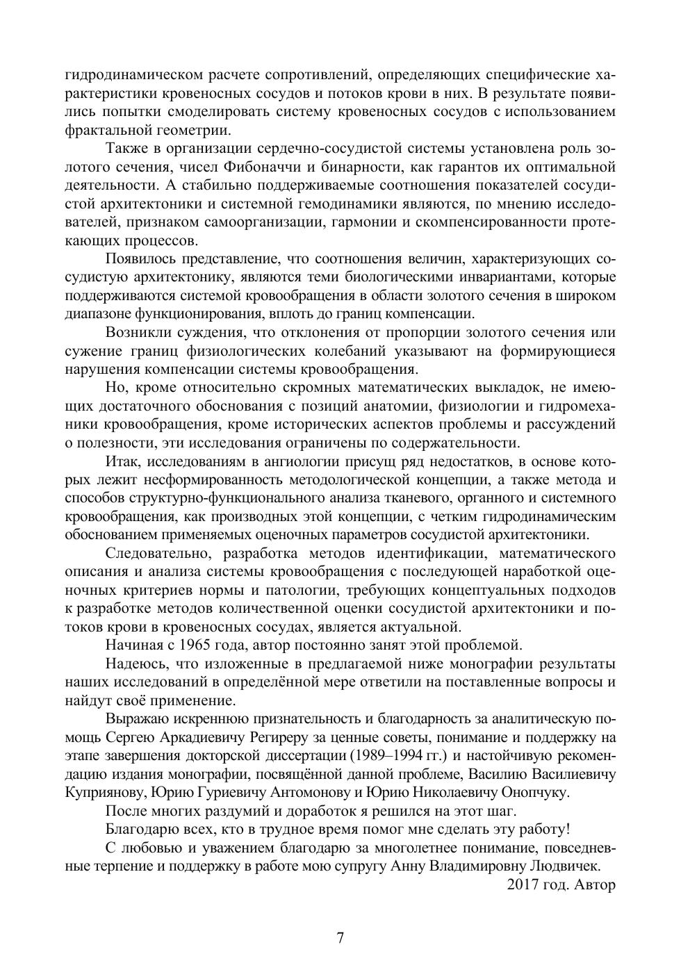 В работе отражены результаты многолетних теоретических и экспериментальных исследований сосудистой архитектоники. Автором сформулирована методологическая концепция исследований в ангиологии, дано биофизическое и гидродинамическое обоснование количественной и качественной оценки структуры и функции тканевого, органного и системного кровоснабжения, сформулирован алгоритм расчетов гидравлических сопротивлений и потерь напора потока крови в кровеносных сосудах в зависимости от их архитектоники, то есть создана математическая модель сосудистого русла, в том числе и зоны микроциркуляции, которая является перспективной в ангиологических исследованиях с целью разработки методов ранней ангиографической диагностики и методов хирургической коррекции и протезирования при патологии кровеносных сосудов, предложена новая развернутая классификация-характеристика кровеносного сосудистого русла, которая отображает морфологические, физиологические, биофизические и фрактальные аспекты системы кровообращения, также показана возможность использования константных величин для оценки ее гармоничности.