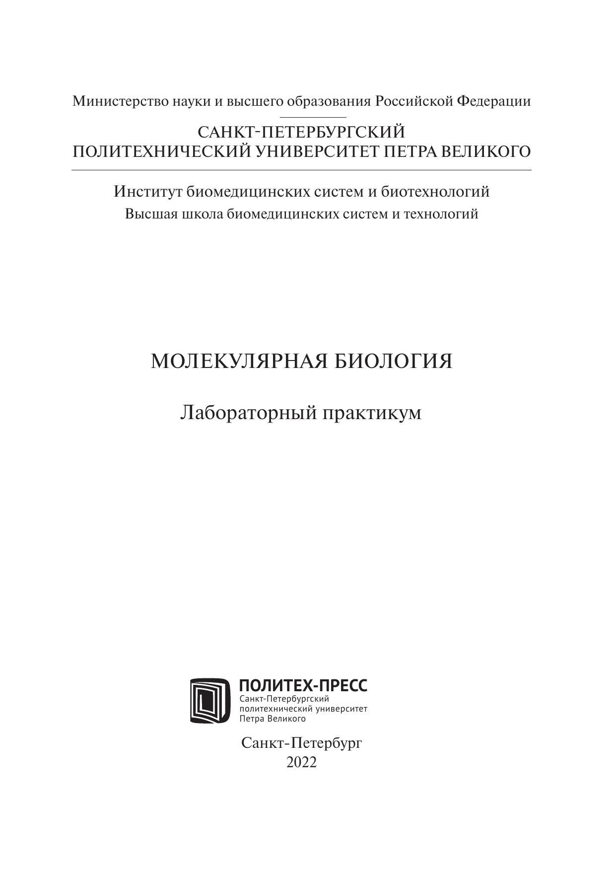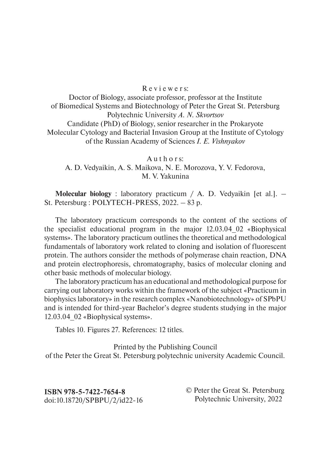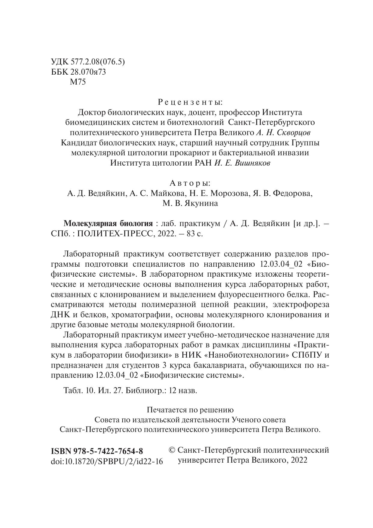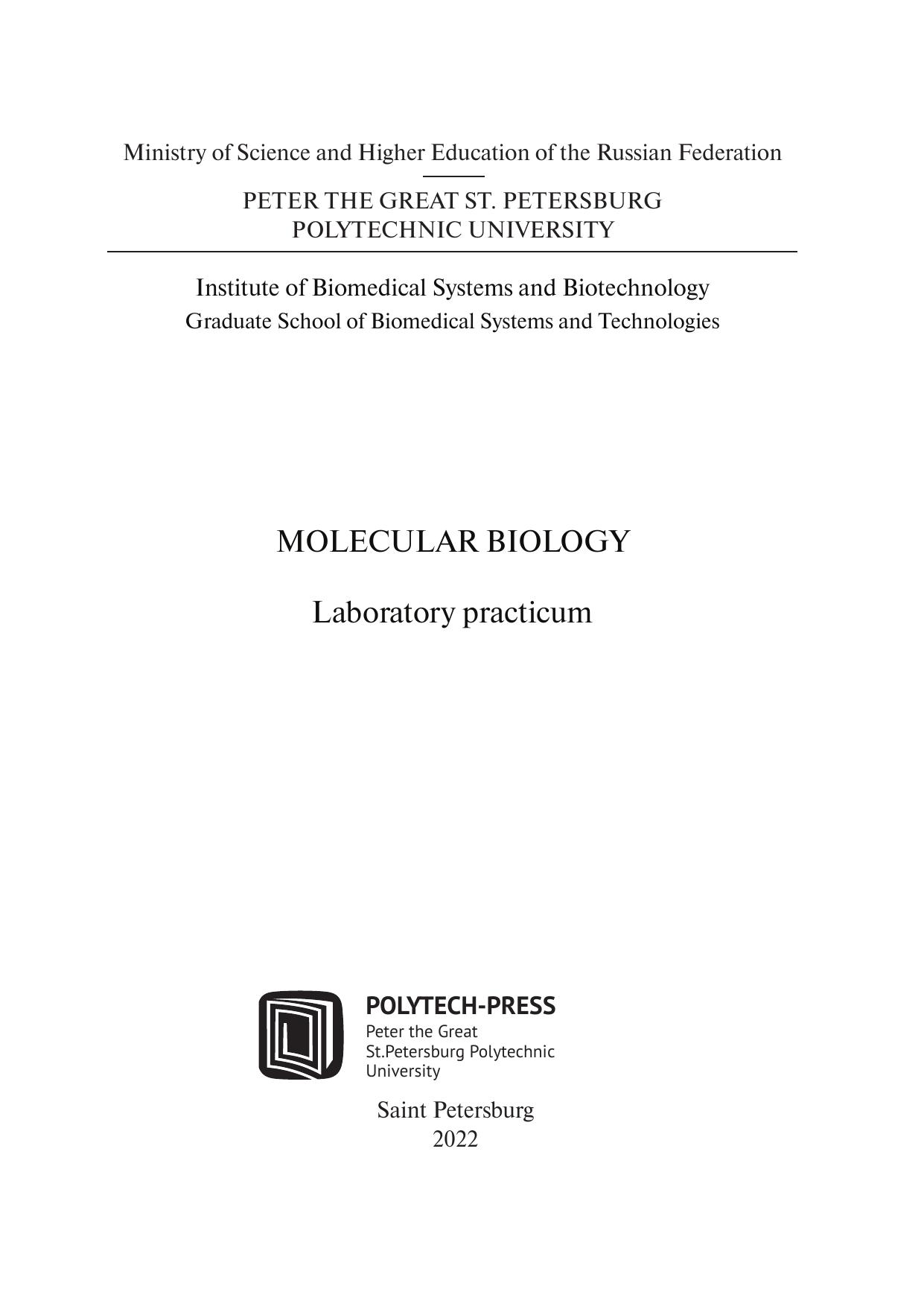Лабораторный практикум соответствует содержанию разделов программы подготовки специалистов по направлению 12.03.04_02 «Биофизические системы». В лабораторном практикуме изложены теоретические и методические основы выполнения курса лабораторных работ, связанных с клонированием и выделением флуоресцентного белка. Рассматриваются методы полимеразной цепной реакции, электрофореза ДНК и белков, хроматографии, основы молекулярного клонирования и другие базовые методы молекулярной биологии. Лабораторный практикум имеет учебно-методическое назначение для выполнения курса лабораторных работ в рамках дисциплины «Практикум в лаборатории биофизики» в НИК «Нанобиотехнологии» СПбПУ и предназначен для студентов 3 курса бакалавриата, обучающихся по направлению 12.03.04_02 «Биофизические системы».