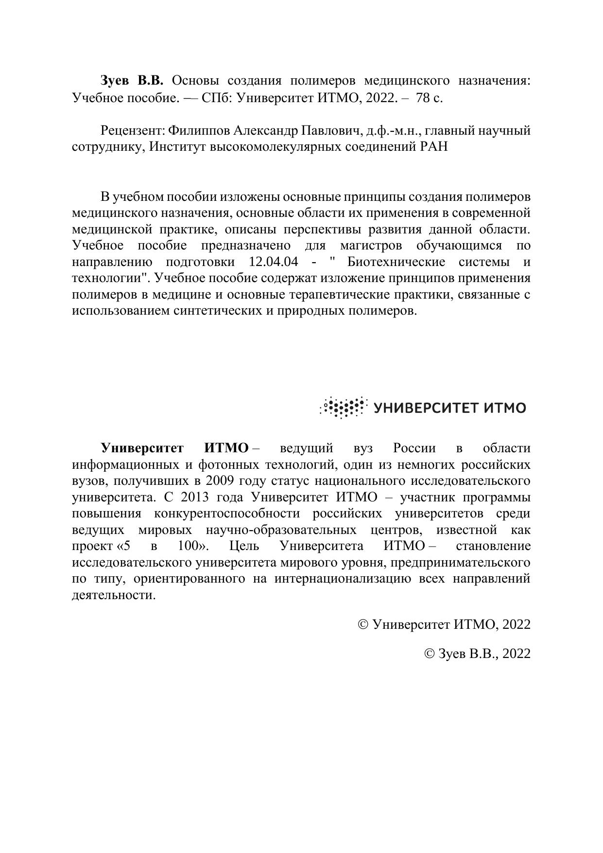 В учебном пособии изложены основные принципы создания полимеров медицинского назначения, основные области их применения в современной медицинской практике, описаны перспективы развития данной области. Учебное пособие предназначено для магистров обучающимся по направлению подготовки 12.04.04 - " Биотехнические системы и технологии". Учебное пособие содержат изложение принципов применения полимеров в медицине и основные терапевтические практики, связанные с использованием синтетических и природных полимеров.