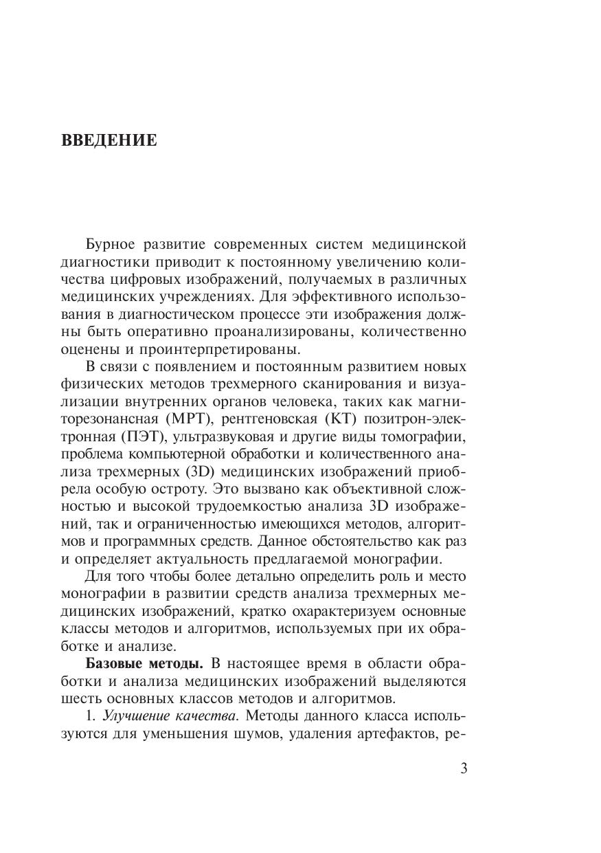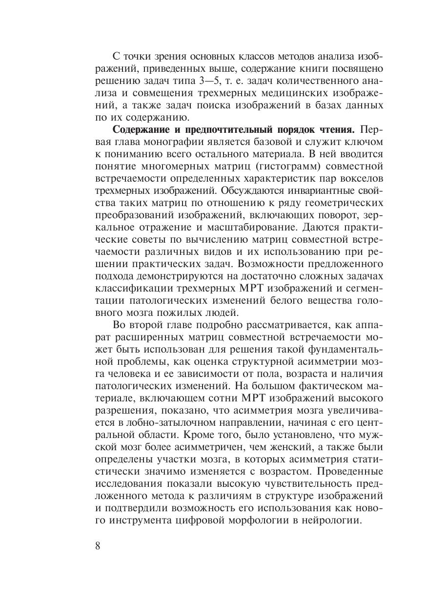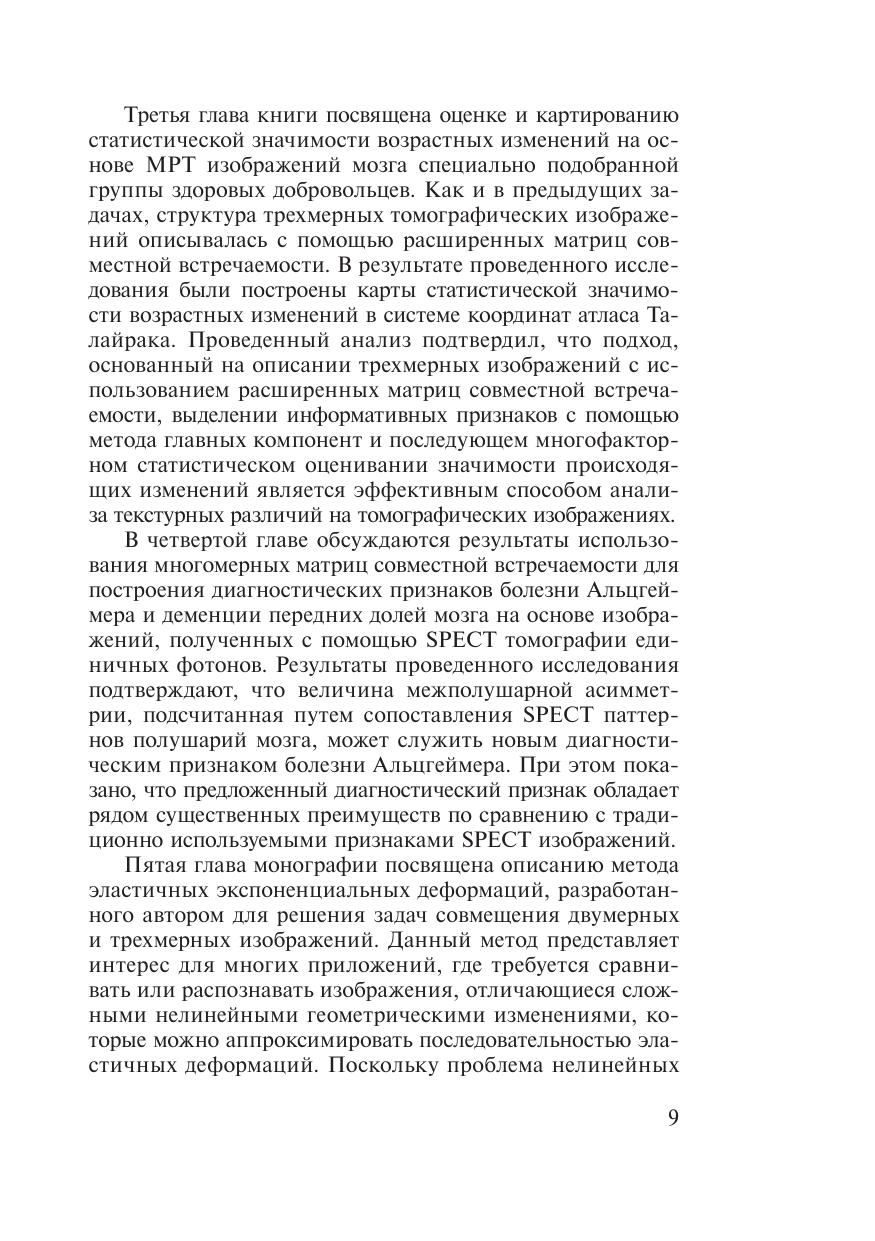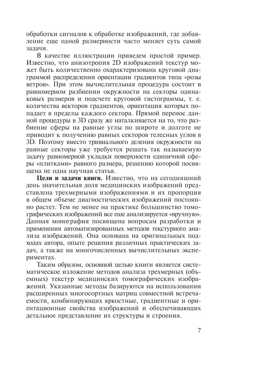 Книга посвящена одному из новых и многообещающих направлений компьютерного анализа томографических изображений — методам анализа трехмерных (объемных) текстур. Указанные методы базируются на использовании многосортных матриц совместной встречаемости, комбинирующих яркостные, градиентные и ориентационные свойства изображений. Использование предлагаемого аппарата иллюстрируется на примере задач количественного анализа МРТ изображений головно- го мозга, совмещения трехмерных медицинских изображений, а также задач поиска изображений в базах данных по их содержанию. Целевой аудиторией книги являются ученые и специалисты, работающие в области медицинской информатики, а также в области систем обработки и количественного анализа трехмерных изображений с при- ложением к задачам медицинской диагностики. Кроме того, данная кни- га может быть полезна для исследователей и специалистов, занимающихся компьютерной томографией, радиологов, нейрологов, а также студентов соответствующих специальностей, профессиональная деятельность и научные интересы которых тесно связаны с применением компьютеров в медицине.