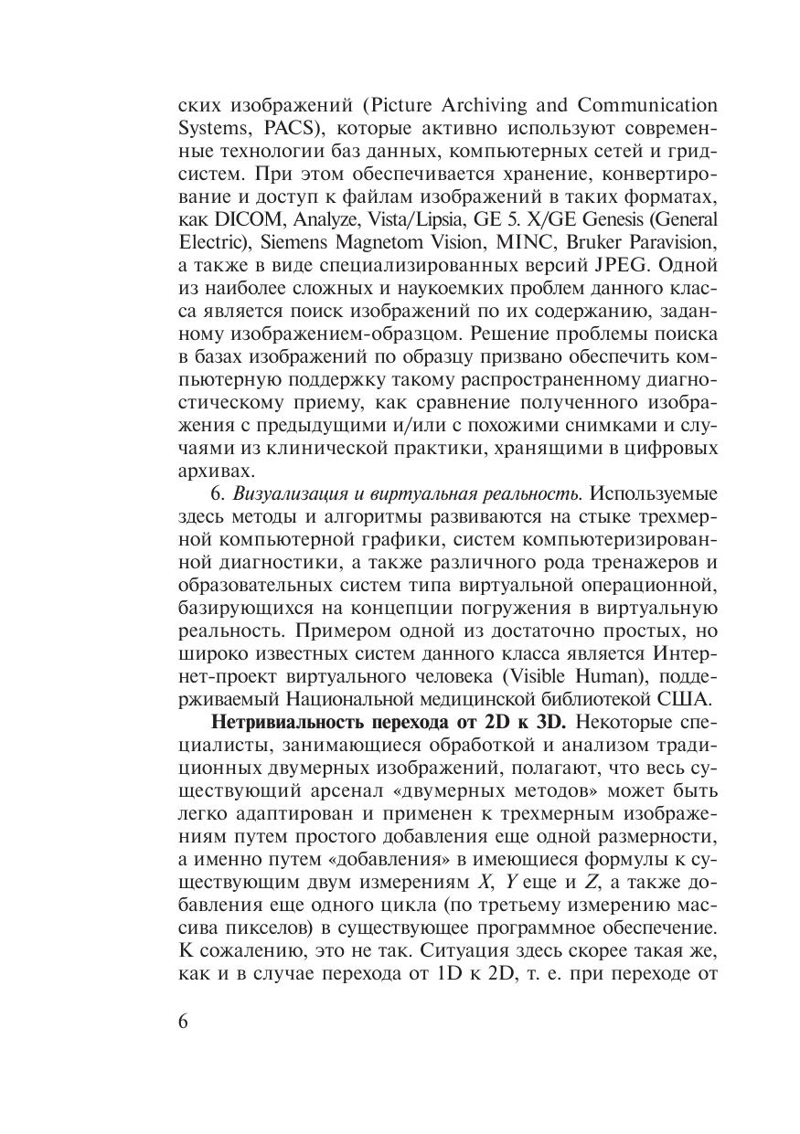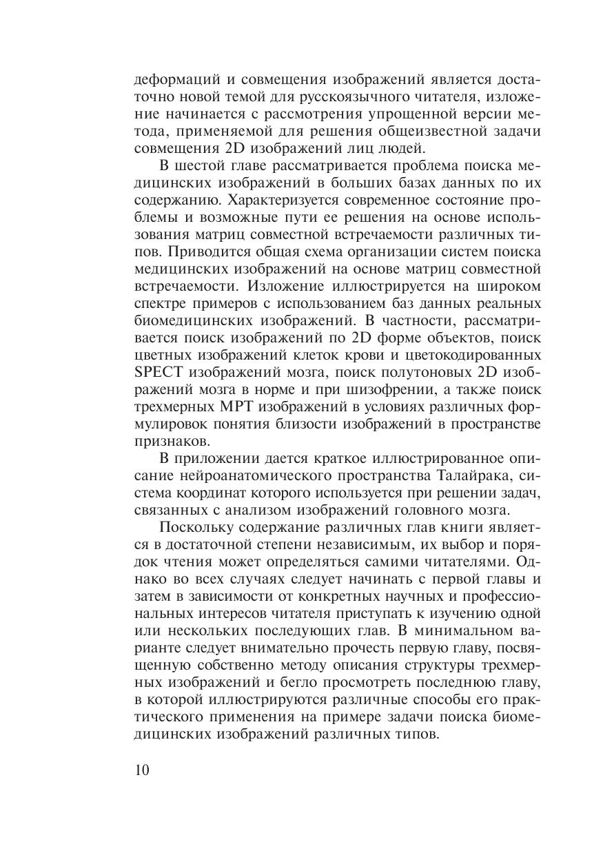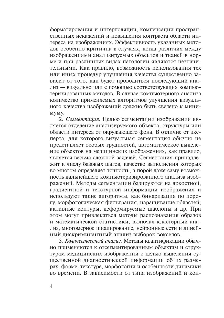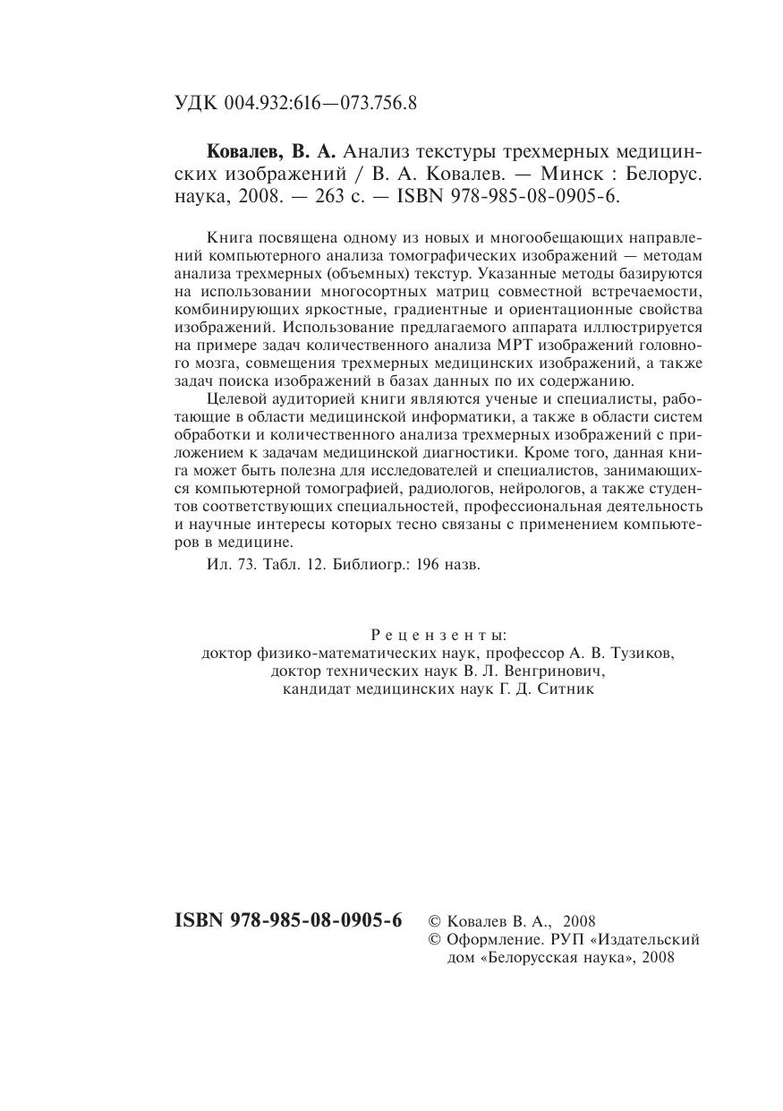 Книга посвящена одному из новых и многообещающих направлений компьютерного анализа томографических изображений — методам анализа трехмерных (объемных) текстур. Указанные методы базируются на использовании многосортных матриц совместной встречаемости, комбинирующих яркостные, градиентные и ориентационные свойства изображений. Использование предлагаемого аппарата иллюстрируется на примере задач количественного анализа МРТ изображений головно- го мозга, совмещения трехмерных медицинских изображений, а также задач поиска изображений в базах данных по их содержанию. Целевой аудиторией книги являются ученые и специалисты, работающие в области медицинской информатики, а также в области систем обработки и количественного анализа трехмерных изображений с при- ложением к задачам медицинской диагностики. Кроме того, данная кни- га может быть полезна для исследователей и специалистов, занимающихся компьютерной томографией, радиологов, нейрологов, а также студентов соответствующих специальностей, профессиональная деятельность и научные интересы которых тесно связаны с применением компьютеров в медицине.