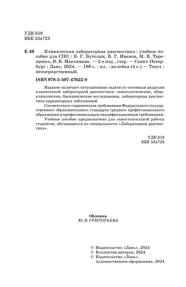 Издание включает ситуационные задачи по основным разделам клинической лабораторной диагностики: гематологические, общеклинические, биохимические исследования, лабораторная диагностика паразитарных заболеваний. Соответствует современным требованиям Федерального государственного образовательного стандарта среднего профессионального образования и профессиональным квалификационным требованиям. Учебное пособие предназначено для самостоятельной работы студентов, обучающихся по специальности «Лабораторная диагностика».