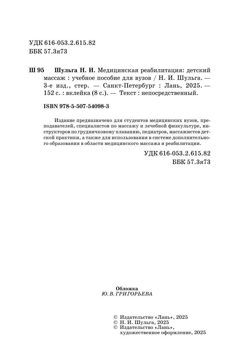 Издание предназначено для студентов медицинских вузов, преподавателей, специалистов по массажу и лечебной физкультуре, инструкторов по грудничковому плаванию, педиатров, массажистов детской практики, а также для использования в системе дополнительного образования в области медицинского массажа и реабилитации.