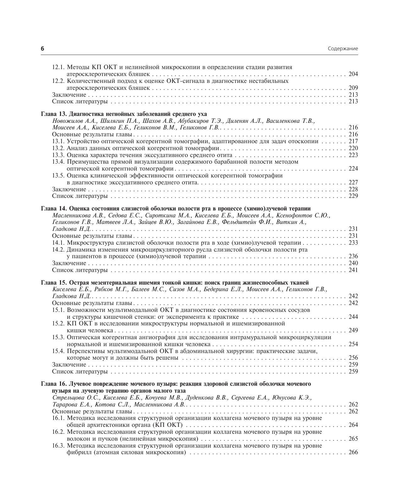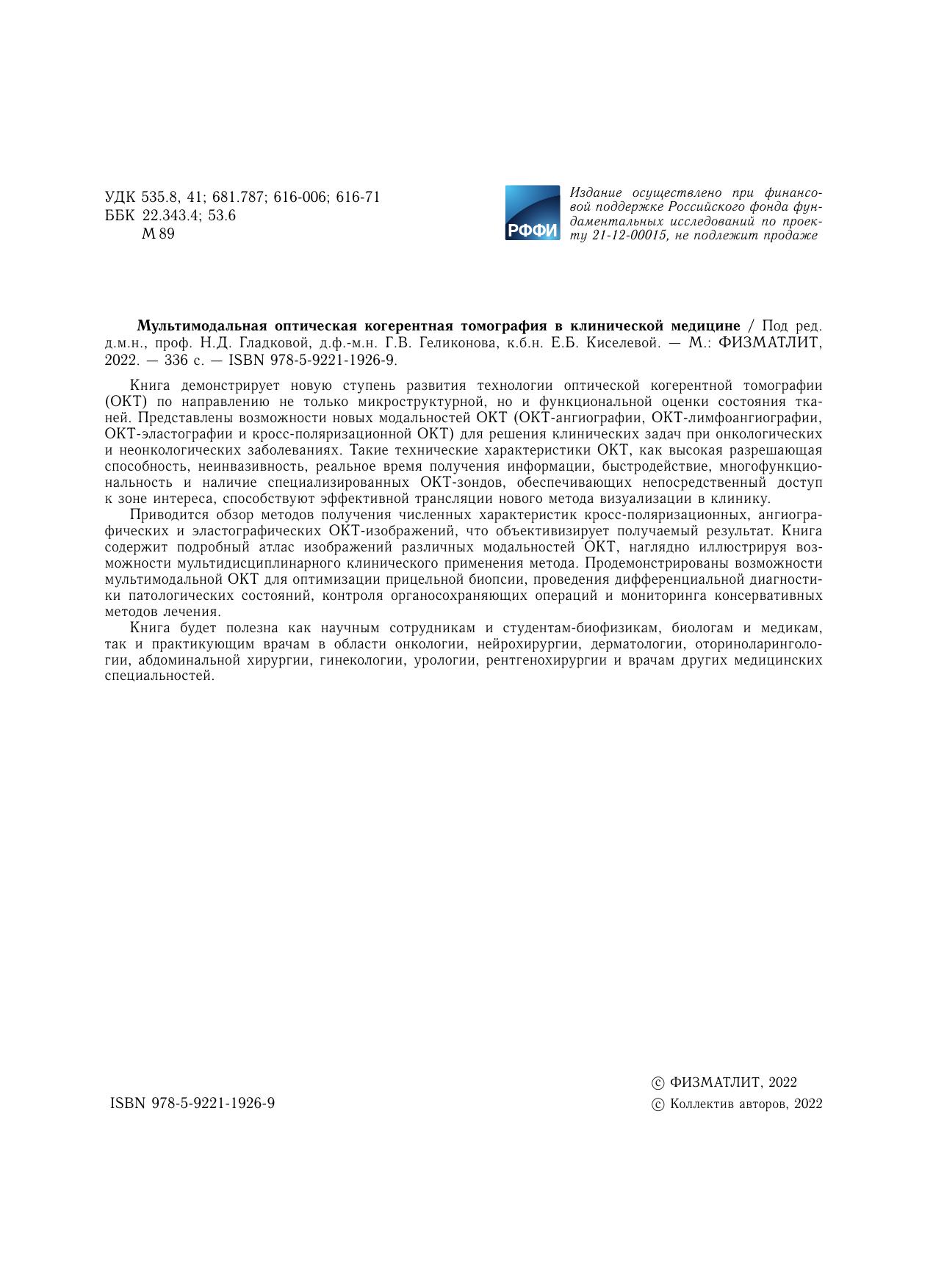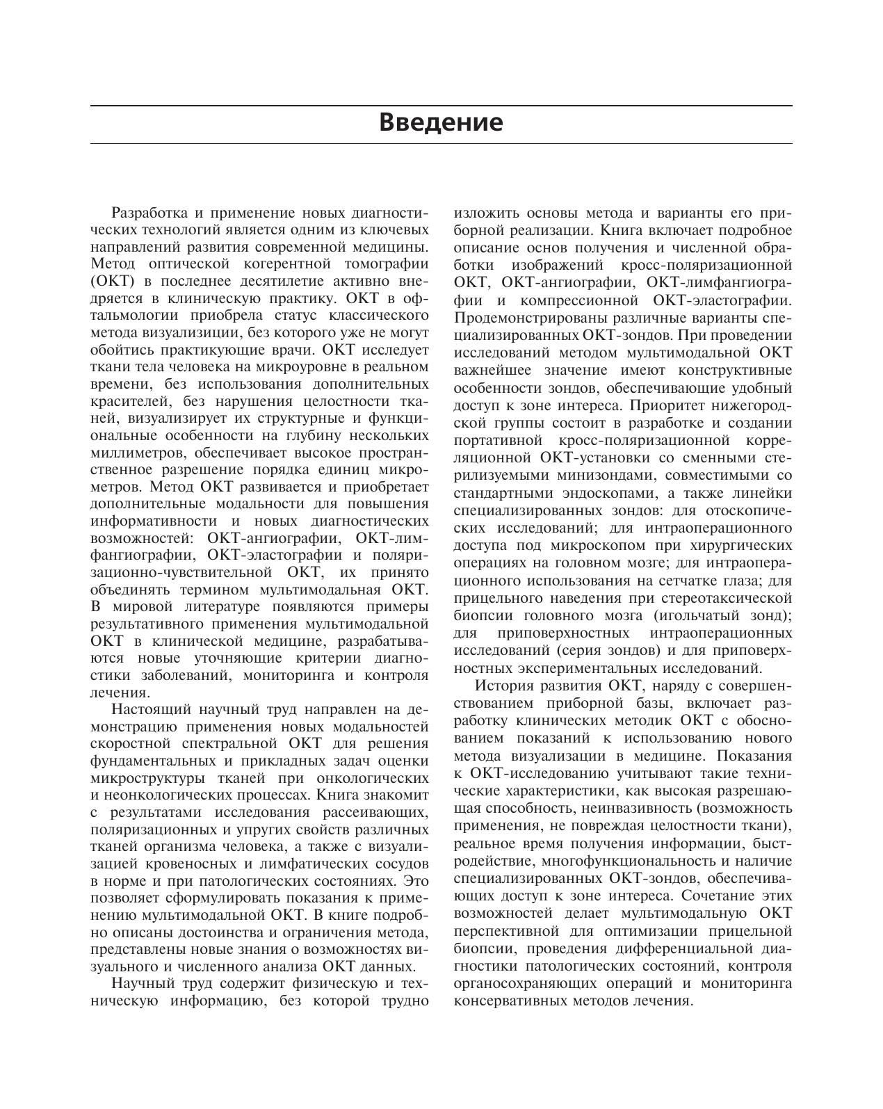 Приводится обзор методов получения численных характеристик кросс-поляризационных, ангиографических и эластографических ОКТ-изображений, что объективизирует получаемый результат. Книга содержит подробный атлас изображений различных модальностей ОКТ, наглядно иллюстрируя возможности мультидисциплинарного клинического применения метода. Продемонстрированы возможности мультимодальной ОКТдля оптимизации прицельной биопсии, проведения дифференциальной диагностики патологических состояний, контроля органосохраняющих операций и мониторинга консервативных методов лечения.