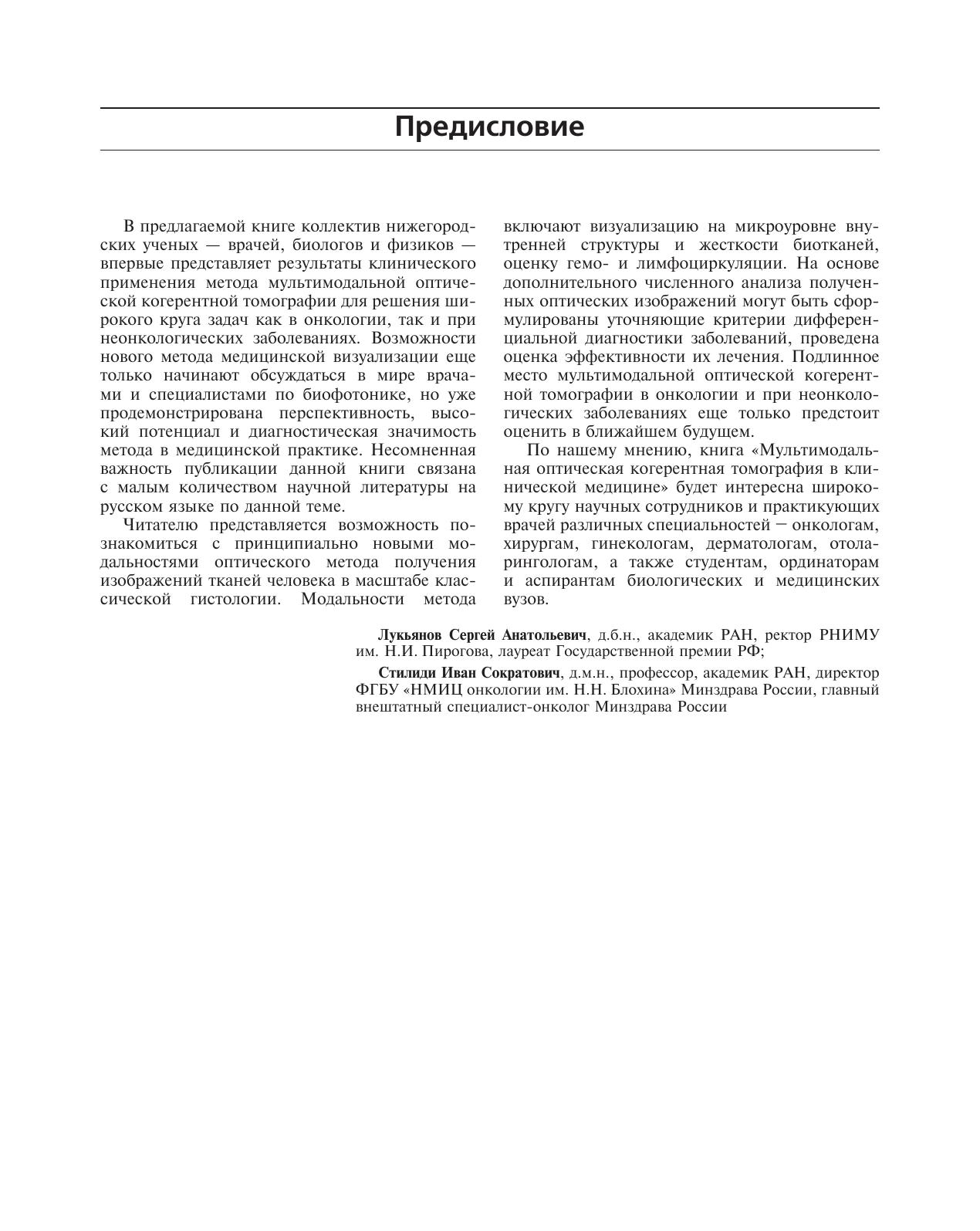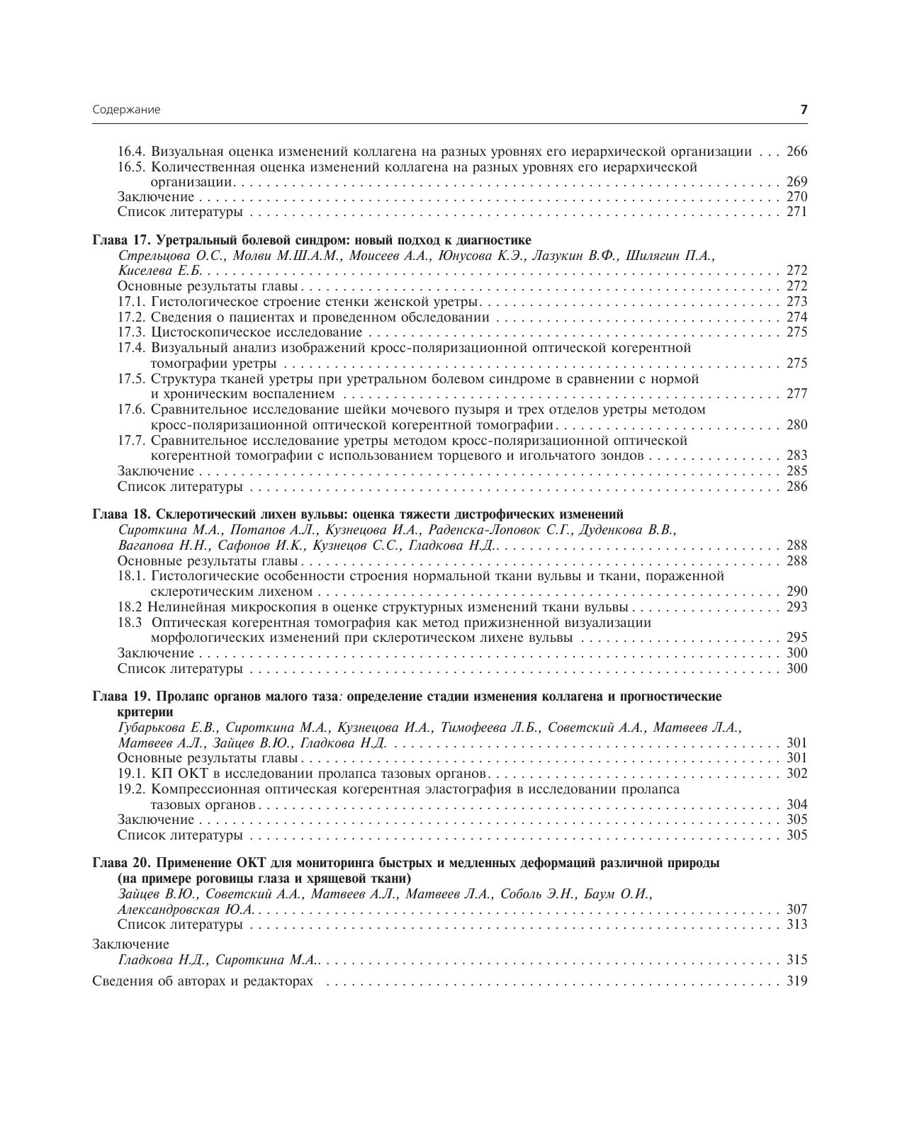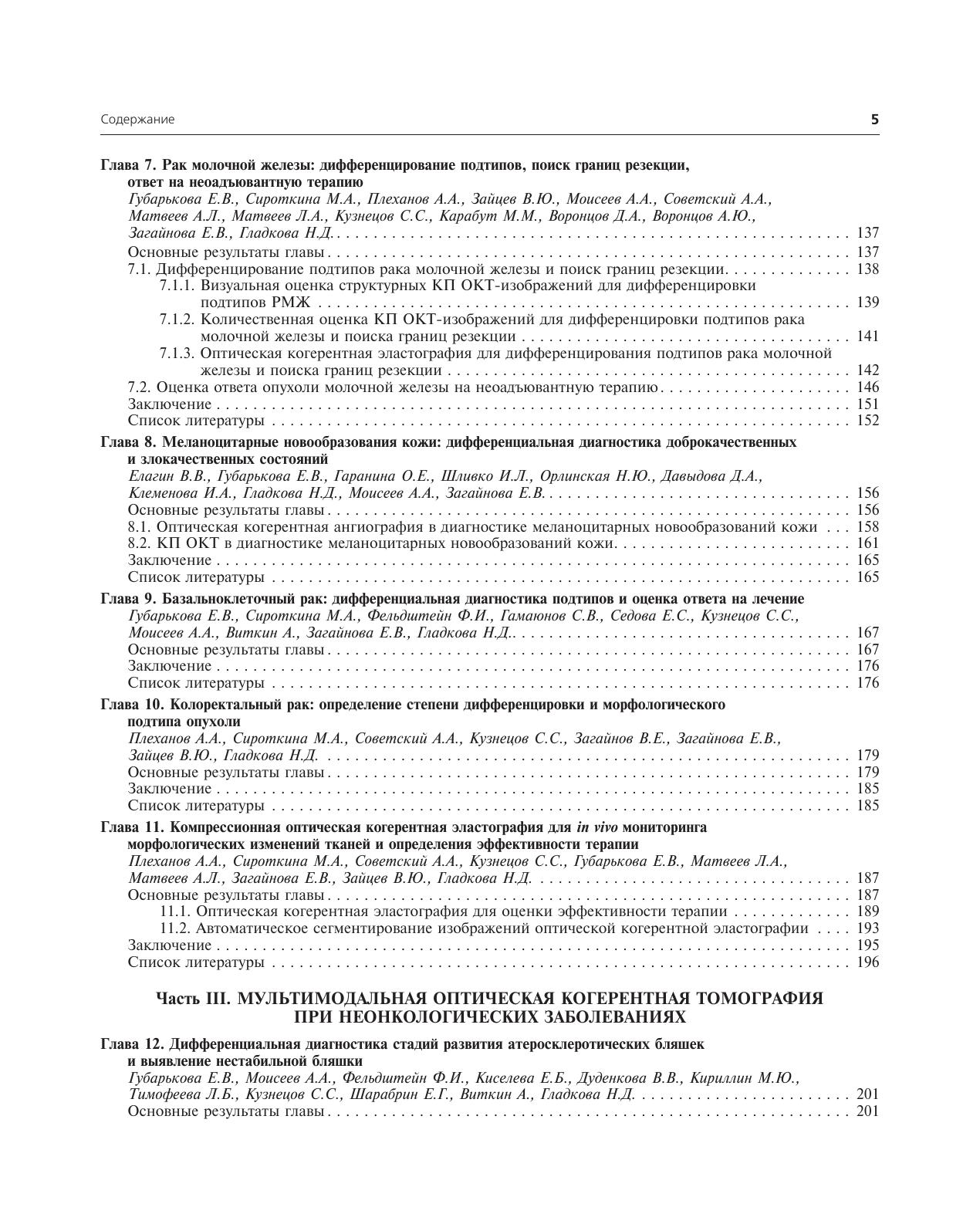 Приводится обзор методов получения численных характеристик кросс-поляризационных, ангиографических и эластографических ОКТ-изображений, что объективизирует получаемый результат. Книга содержит подробный атлас изображений различных модальностей ОКТ, наглядно иллюстрируя возможности мультидисциплинарного клинического применения метода. Продемонстрированы возможности мультимодальной ОКТдля оптимизации прицельной биопсии, проведения дифференциальной диагностики патологических состояний, контроля органосохраняющих операций и мониторинга консервативных методов лечения.