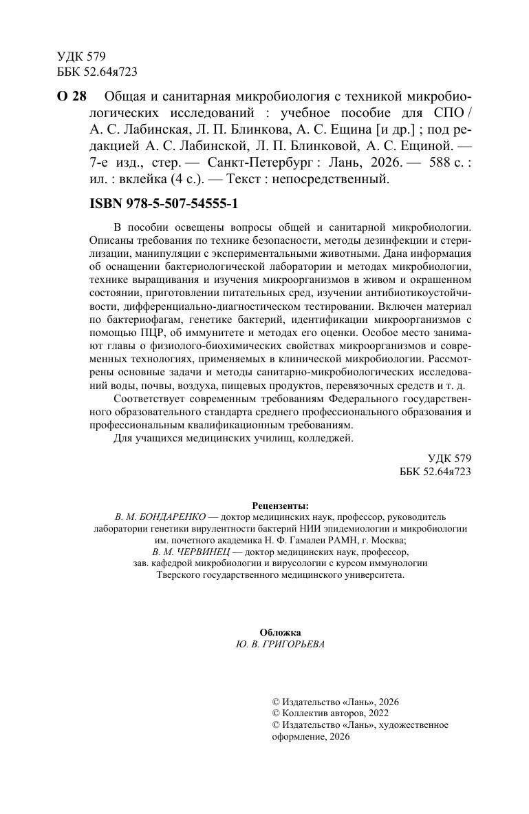 В пособии освещены вопросы общей и санитарной микробиологии. Описаны требования по технике безопасности, методы дезинфекции и стерилизации, манипуляции с экспериментальными животными. Дана информация об оснащении бактериологической лаборатории и методах микробиологии, технике выращивания и изучения микроорганизмов в живом и окрашенном состоянии, приготовлении питательных сред, изучении антибиотикоустойчивости, дифференциально-диагностическом тестировании. Включен материал по бактериофагам, генетике бактерий, идентификации микроорганизмов с помощью ПЦР, об иммунитете и методах его оценки. Особое место занимают главы о физиолого-биохимических свойствах микроорганизмов и современных технологиях, применяемых в клинической микробиологии. Рассмотрены основные задачи и методы санитарно-микробиологических исследований воды, почвы, воздуха, пищевых продуктов, перевязочных средств и т. д. Соответствует современным требованиям Федерального государственного образовательного стандарта среднего профессионального образования и профессиональным квалификационным требованиям.