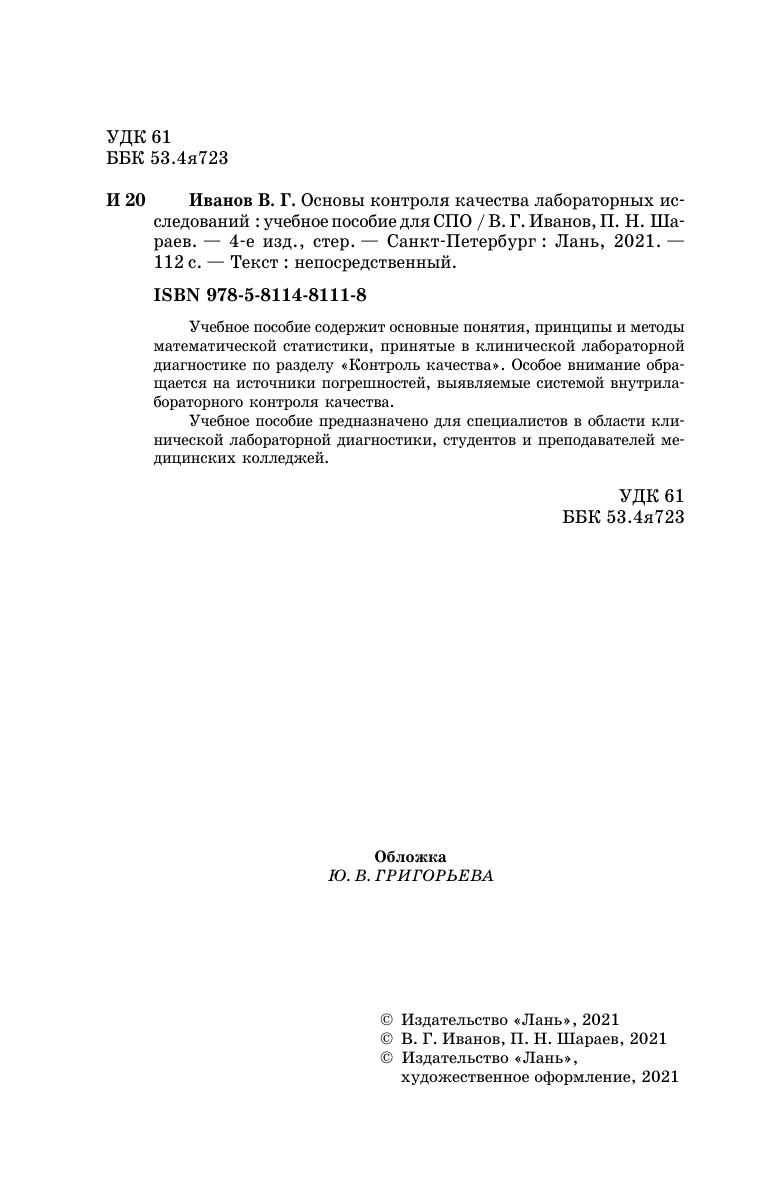 Учебное пособие содержит основные понятия, принципы и методы математической статистики, принятые в клинической лабораторной диагностике по разделу Контроль качества. Особое внимание обращается на источники погрешностей, выявляемые системой внутрилабораторного контроля качества. Учебное пособие предназначено для специалистов в области клинической лабораторной диагностики, студентов и преподавателей медицинских колледжей. Соответствует современным требованиям Федерального государственного образовательного стандарта среднего профессионального образования и профессиональным квалификационным требованиям.