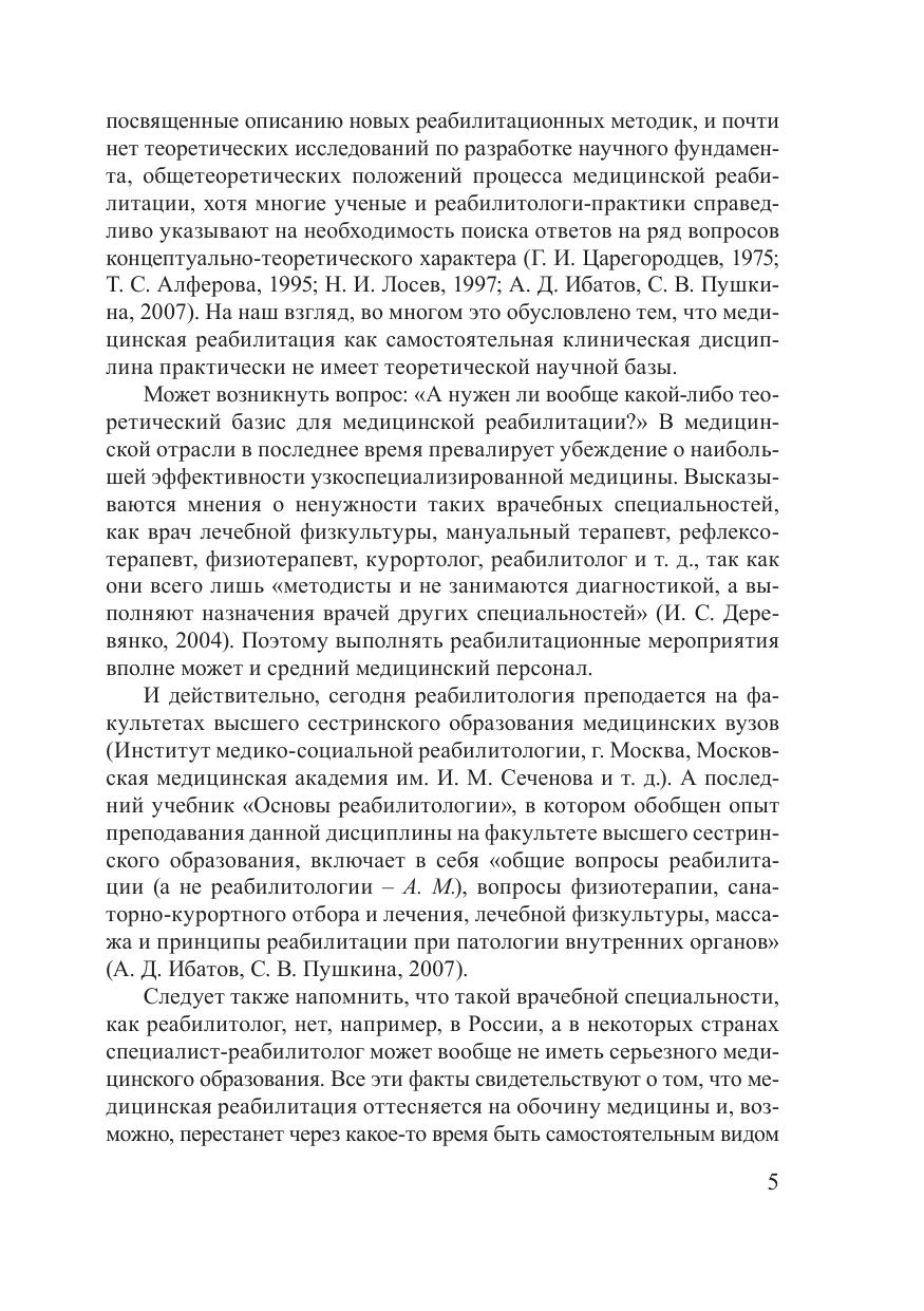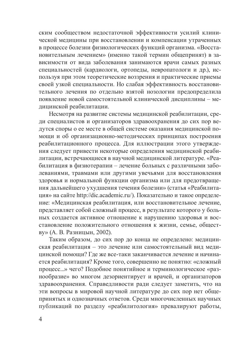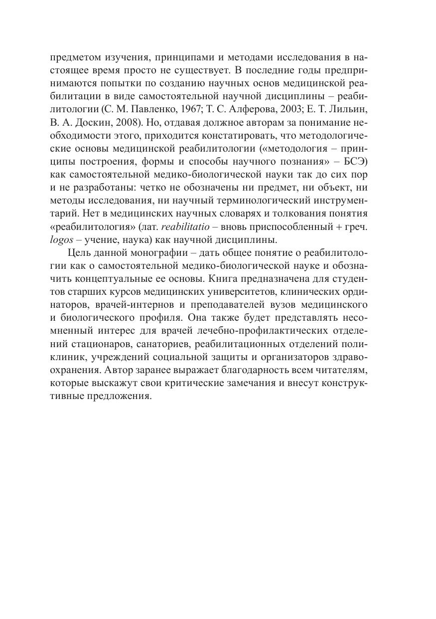 В монографии дается интегративное изложение ряда базовых медико-биологических положений, что позволяет рекомендовать ее в качестве дополнительного пособия при подготовке в рамках некоторых клинических специальностей. На основе классических современных знаний об организме человека представлен теоретический базис процесса медицинской реабилитации. Обоснована необходимость формирования самостоятельной прикладной медико-биологической научной дисциплины – медицинской реабилитологии, изучающей фундаментальные закономерности, механизмы, условия сохранения и развития здоровья, а также процессы выздоровления, восстановления утраченных в процессе болезни функций организма. С современных научных позиций изложены теоретические и медико-социальные предпосылки и теоретические истоки медицинской реабилитологии, раскрыты основные понятия, предмет, объекты и методы ее исследования как прикладной, но самостоятельной медицинской науки. Предназначена для врачей-интернов и клинических ординаторов, для постдипломной подготовки врачей по специальности «медицинская реабилитация», может быть полезна также для студентов медицинских вузов.