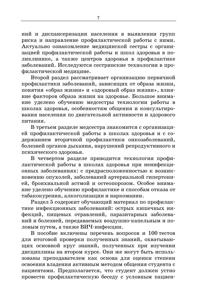 Учебное пособие содержит обучающий материал эффективного общения со слушателями и пациентами для использования в профилактической работе среднего медицинского персонала в школах здоровья, при проведении санитарного просвещения и воспитания среди различных групп населения, в том числе в группах риска.Структура пособия составлена в соответствии с программой раздела ПМ 01. Сестринское обеспечение профилактических мероприятий МДК 01.02 Основы профилактики. Кроме теоретического материала в пособие включены перечень вопросов и 100 тестов для итоговой проверки полученных знаний, охватывающих основной круг вопросов, полученных при изучении дисциплины на втором курсе. Соответствует современным требованиям Федерального государственного образовательного стандарта среднего профессионального образования и профессиональным квалификационным требованиям. Пособие предназначено для подготовки студентов среднего профессионального образования по специальности «Сестринское дело», а также может оказать помощь в профилактической работе медицинских сестер врача общей практики (семейного врача).