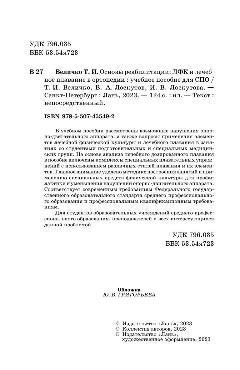 В учебном пособии рассмотрены возможные нарушения опорно-двигательного аппарата, а также вопросы применения элементов лечебной физической культуры и лечебного плавания в занятиях со студентами подготовительных и специальных медицинских групп. На основе анализа лечебного дозированного плавания в пособие включены комплексы специальных плавательных упражнений с использованием различных стилей плавания и их элементов. Главное внимание уделено методике построения занятий и применению специальных средств физической культуры для профилактики и уменьшения нарушений опорно-двигательного аппарата. Соответствует современным требованиям Федерального государственного образовательного стандарта среднего профессионального образования и профессиональным квалификационным требованиям. Для студентов образовательных учреждений среднего профессионального образования, преподавателей и всех интересующихся данной проблемой.