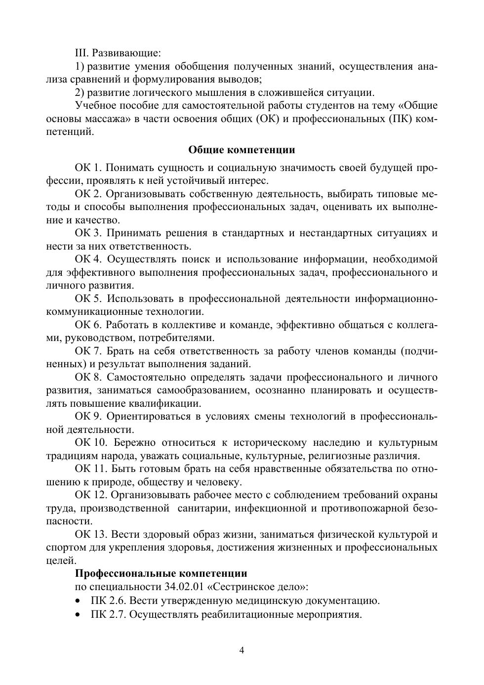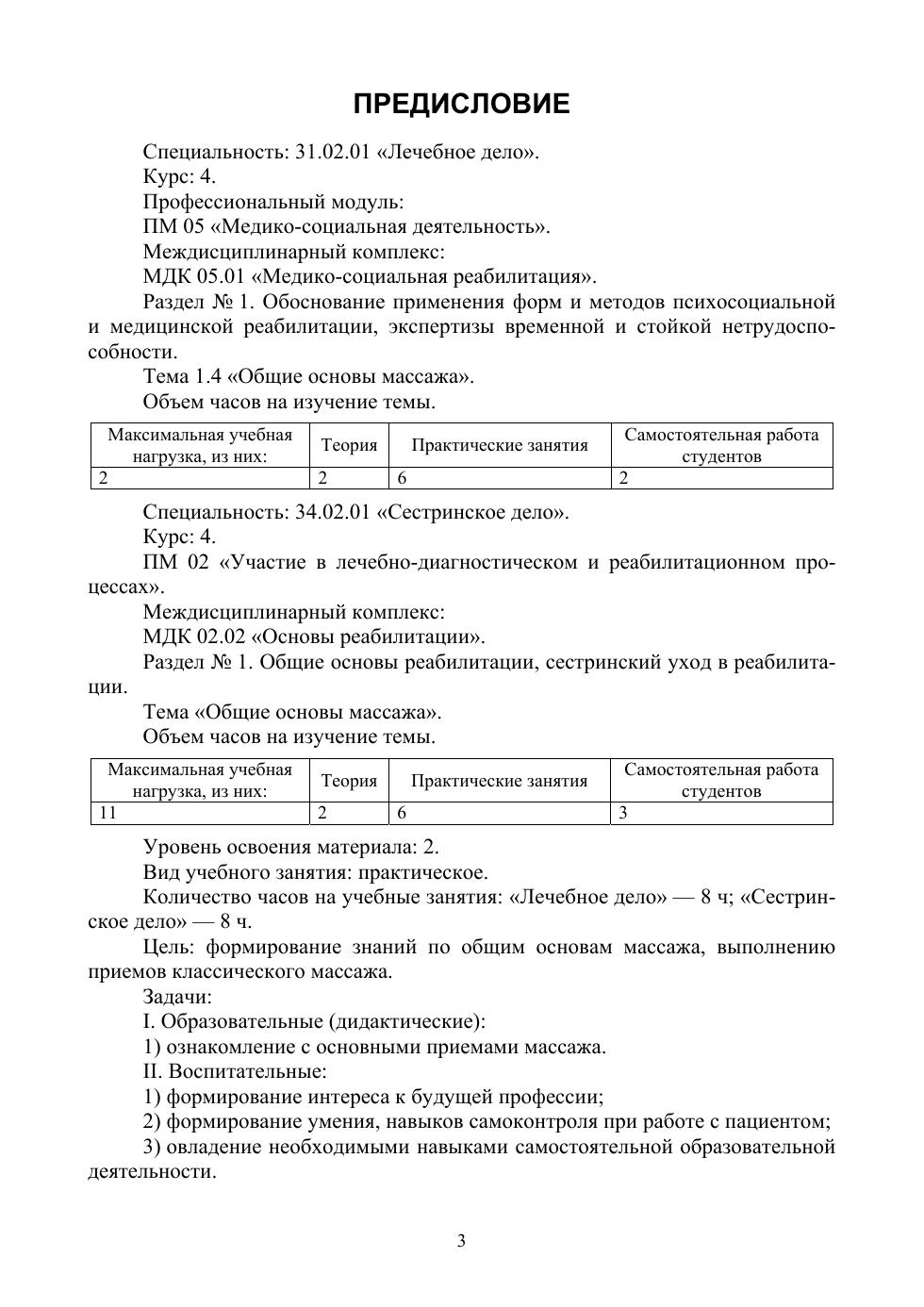 Пособие содержит теоретический материал по разделу «Общие основы массажа», различные вопросы и задания. Задания в пособии предназначены для самостоятельной работы студентов с целью лучшего усвоения, систематизации и закрепления знаний, полученных на теоретических и практических занятиях. Пособие составлено в соответствии с требованиями ФГОС и ПМ 02 «Участие в лечебно-диагностическом и реабилитационном процессах», МДК 02.02 «Основы реабилитации (Общие основы массажа). Сестринское дело».