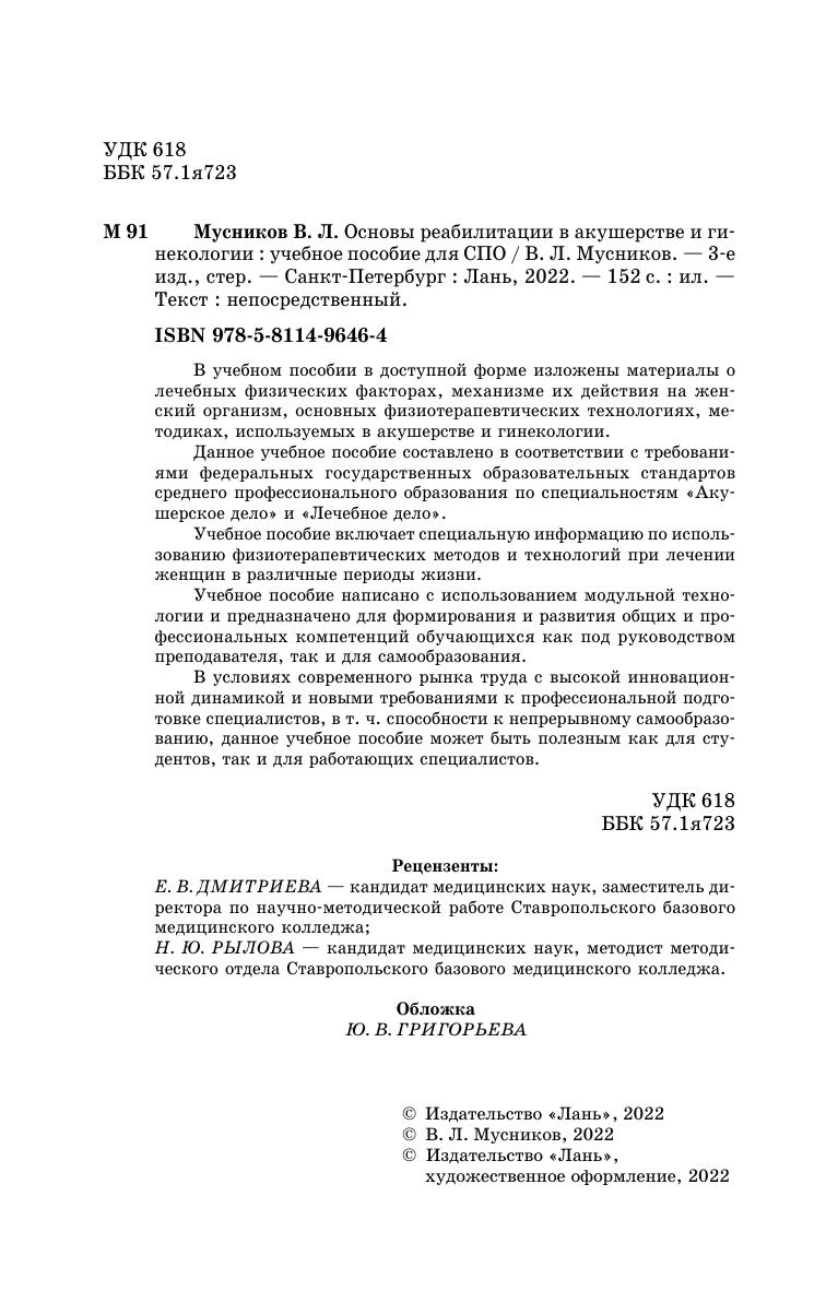 В учебном пособии в доступной форме изложены материалы о лечебных физических факторах, механизме их действия на женский организм, основных физиотерапевтических технологиях, методиках, используемых в акушерстве и гинекологии. Данное учебное пособие составлено в соответствии с требованиями Федеральных государственных образовательных стандартов среднего профессионального образования по специальностям «Акушерское дело» и «Лечебное дело». Учебное пособие включает специальную информацию по использованию физиотерапевтических методов и технологий при лечении женщин в различные периоды жизни. Учебное пособие написано с использованием модульной технологии и предназначено для формирования и развития общих и профессиональных компетенций обучающихся как под руководством преподавателя, так и для самообразования. В условиях современного рынка труда с высокой инновационной динамикой и новыми требованиями к профессиональной подготовке специалистов, в т. ч. способности к непрерывному самообразованию, данное учебное пособие может быть полезным как для студентов, так и для работающих специалистов.