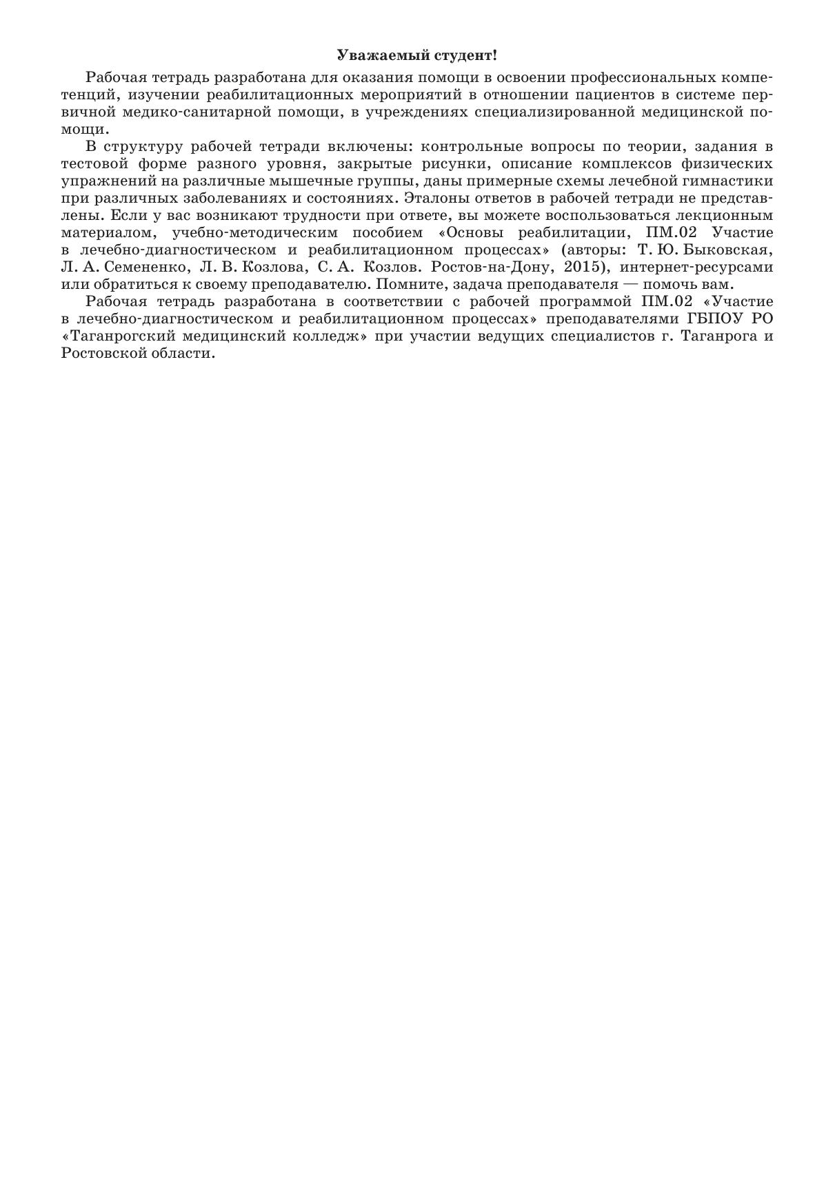 Рабочая тетрадь разработана в соответствии с рабочей программой ПМ 02. «Участие в лечебно-диагностическом и реабилитационном процессах» для оказания помощи в освоении профессиональных компетенций, изучении реабилитационных мероприятий в отношении пациентов в системе первичной медико-санитарной помощи, в учреждениях специализированной медицинской помощи.
