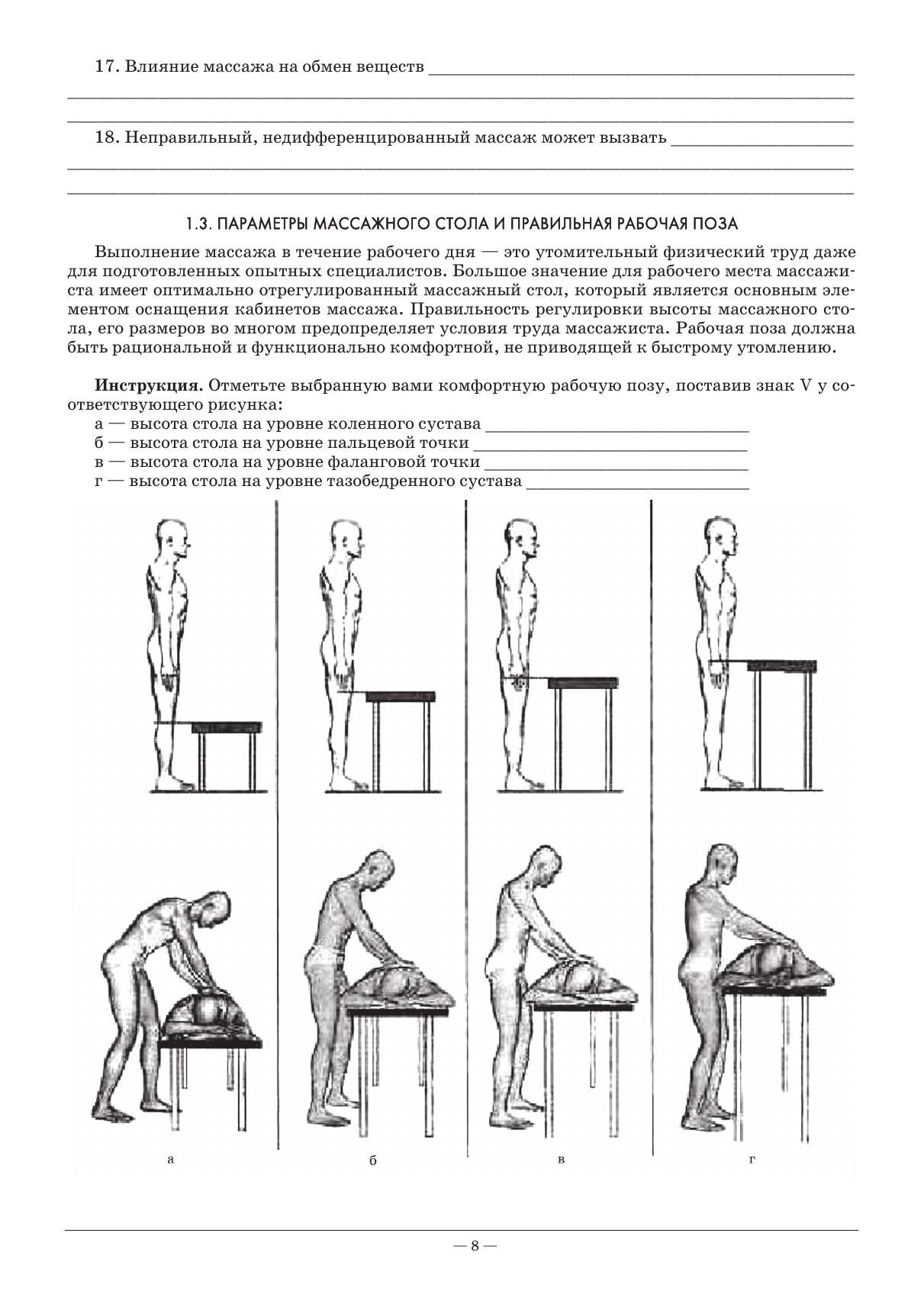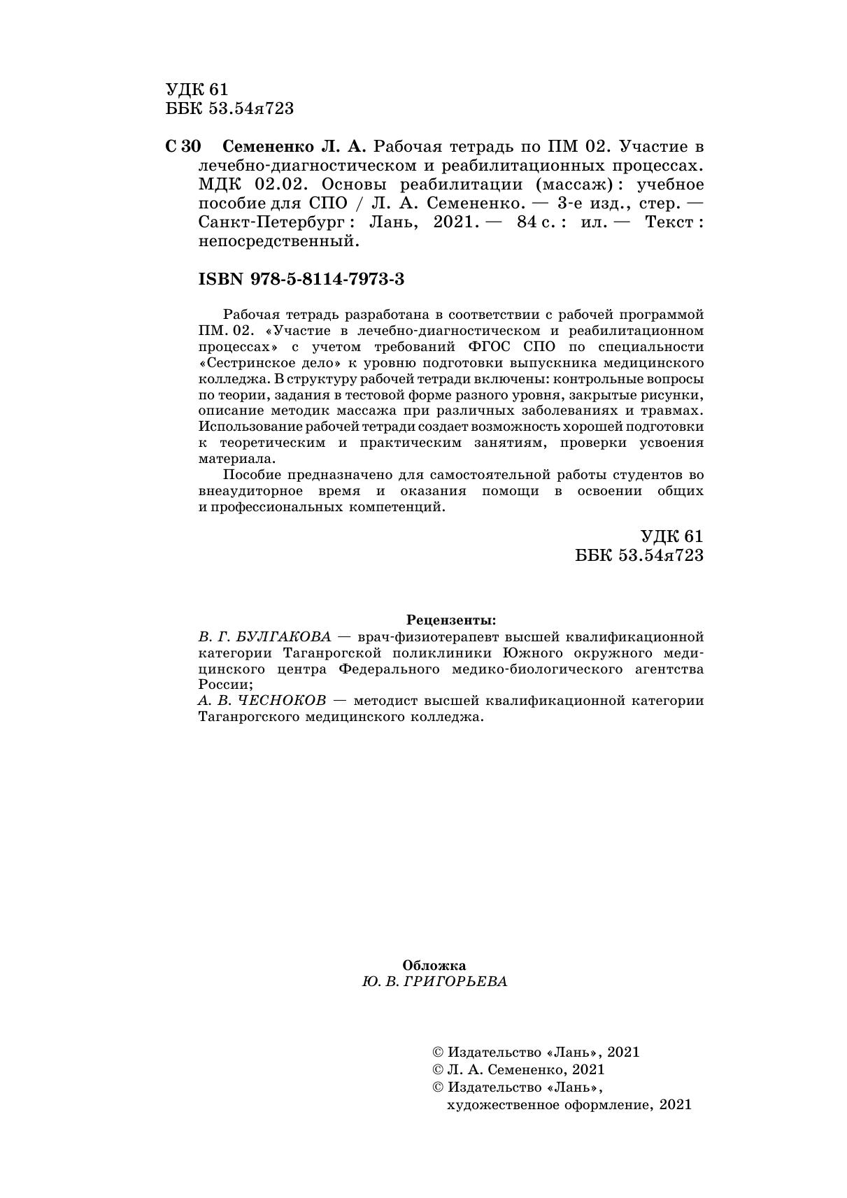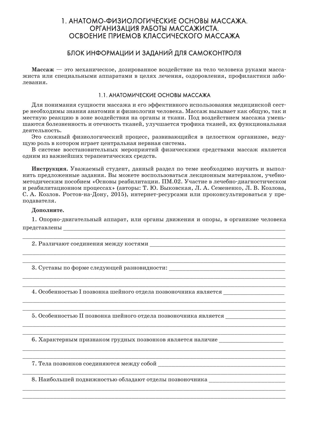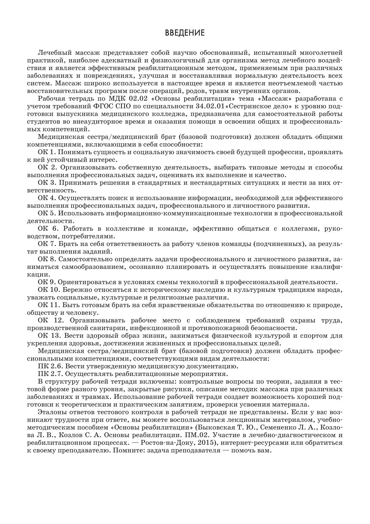 Рабочая тетрадь разработана в соответствии с рабочей программой ПМ 02. «Участие в лечебно-диагностическом и реабилитационном процессах» с учетом требований ФГОС СПО по специальности «Сестринское дело» к уровню подготовки выпускника медицинского колледжа. В структуру рабочей тетради включены: контрольные вопросы по теории, задания в тестовой форме разного уровня, закрытые рисунки, описание методик массажа при различных заболеваниях и травмах. Использование рабочей тетради создает возможность хорошей подготовки к теоретическим и практическим занятиям, проверки усвоения материала.