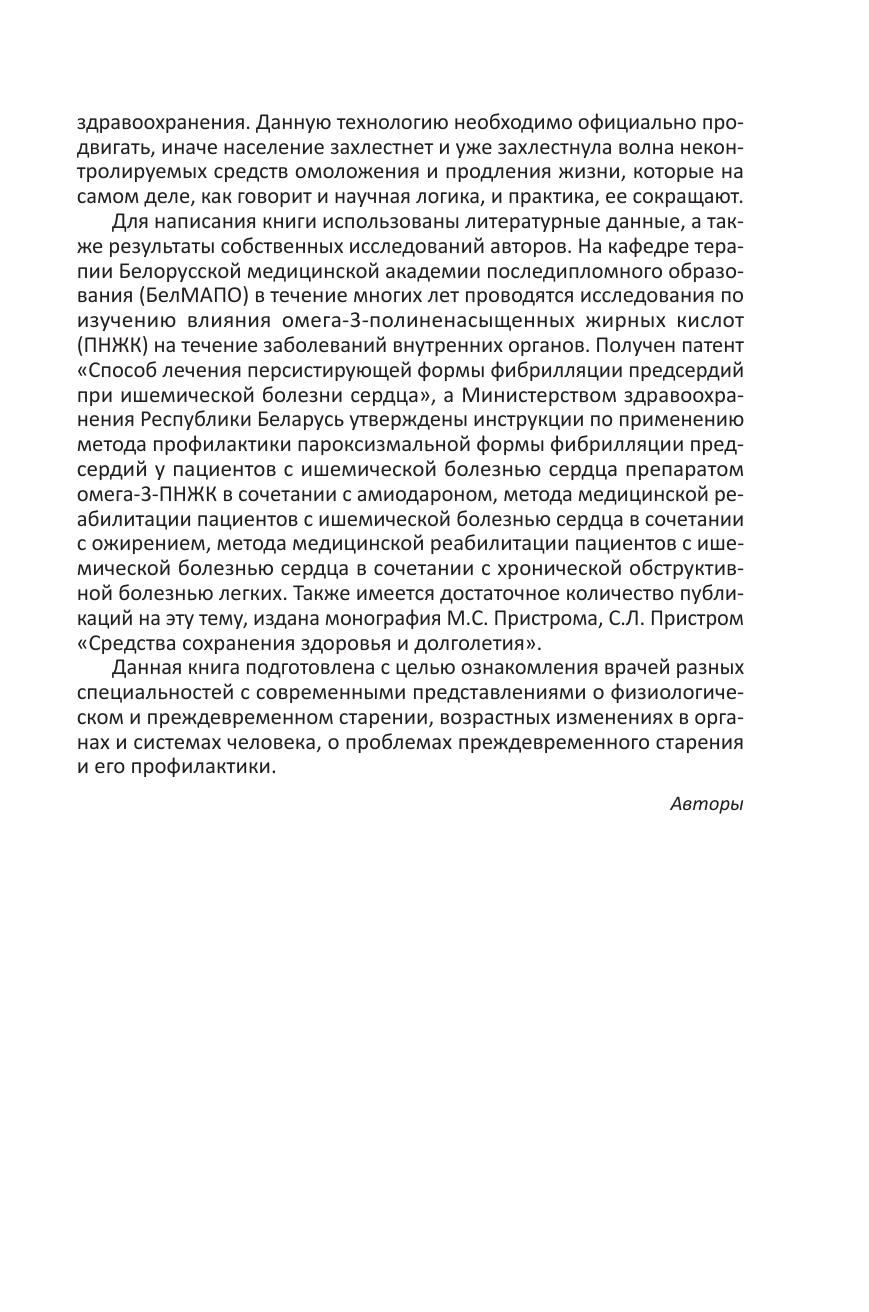 Освещаются основные проблемы, связанные со старением и долголетием. Приводятся сведения о факторах риска преждевременного старения, возрастных изменениях систем и функций организма, роли терапии в сохранении здоровья. Представлены современные взгляды на средства предупреждения преждевременного старения, включая роль двигательной активности, рационального питания, применения лекарственных средств, способствующих долголетию. Профилактика старения_x000D_