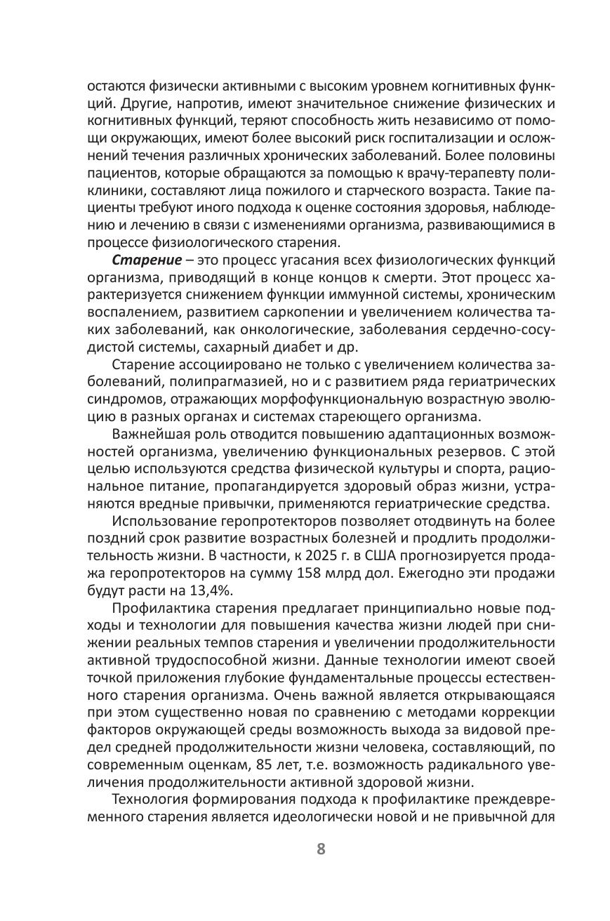 предлагает принципиально новые подходы и технологии для повышения качества жизни людей при снижении реальных темпов старения и увеличении продолжительности активной трудоспособной жизни. Для медицинских работников разных специальностей, а также для широкого круга читателей, интересующихся проблемами сохранения здоровья и долголетия.
