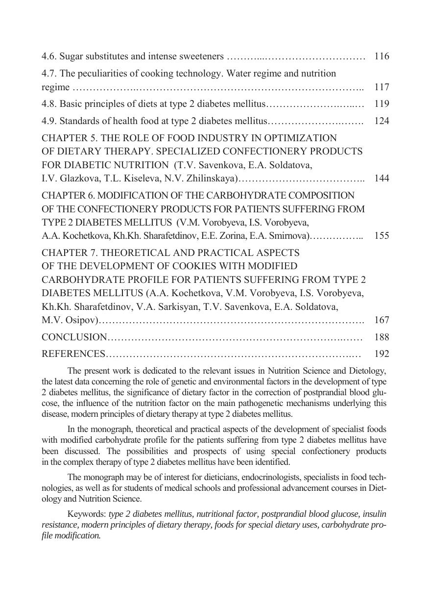 В издании подробно рассмотрены актуальные вопросы нутрициологии и диетологии, содержащие современные данные о роли факторов окружающей среды и генетических факторов в развитии сахарного диабета 2 типа, значении алиментарного фактора в коррекции постпрандиальной гликемии и его влиянии на основные патогенетические механизмы, лежащие в основе заболевания, современные принципы диетотерапии при сахарном диабете 2 типа. В монографии рассмотрены теоретические и практические аспекты разработки специализированных пищевых продуктов с модифицированным углеводным профилем для больных сахарным диабетом 2 типа, а также проанализированы возможности и перспективы применения специализированных кондитерских изделий диабетического питания в комплексной терапии сахарного диабета 2 типа. Издание предназначено для врачей-диетологов, эндокринологов, специалистов в области пищевых технологий, а также студентов высших медицинских учебных заведений, курсантов сертификационных и тематических циклов усовершенствования и специализации врачей по диетологии и нутрициологии.