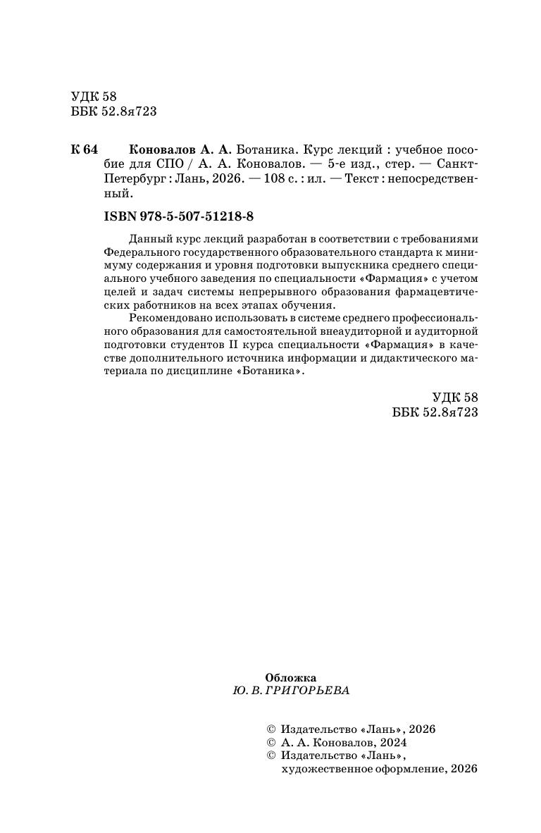Данный курс лекций разработан в соответствии с требованиями Федерального государственного образовательного стандарта к минимуму содержания и уровня подготовки выпускника среднего специального учебного заведения по специальности «Фармация», с учетом целей и задач системы непрерывного образования фармацевтических работников на всех этапах обучения. Рекомендовано использовать в системе среднего профессионального образования для самостоятельной внеаудиторной и аудиторной подготовки студентов II курса специальности «Фармация» в качестве дополнительного источника информации и дидактического материала по дисциплине «Ботаника».