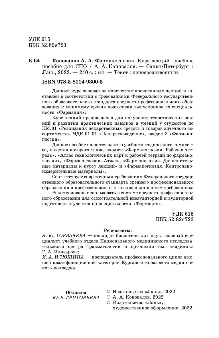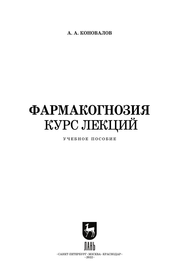 Данный курс основан на конспектах прочитанных лекций и составлен в соответствии с требованиями Федерального государственного образовательного стандарта среднего профессионального образования к минимуму уровня подготовки выпускников по специальности «Фармация». Курс лекций предназначен для получения теоретических знаний и развития практических навыков и умений у студентов по ПМ.01 «Реализация лекарственных средств и товаров аптечного ассортимента» МДК.01.01 «Лекарствоведение», раздел 2 «Фармако-гнозия». Данное пособие является частью учебно-методического комплекса, в состав которого также входят: «Фармакогнозия. Рабочая тетрадь», «Атлас технологических карт к рабочей тетради по фармако-гнозии», «Фармакогнозия. Атлас», «Фармакогнозия. Дополнительные материалы к курсу лекций» и «Фармакогнозия. Контрольно- измерительные материалы». Соответствует современным требованиям Федерального государственного образовательного стандарта среднего профессионального образования и профессиональным квалификационным требованиям. Рекомендовано использовать в системе среднего профессионального образования для самостоятельной внеаудиторной и аудиторной подготовки студентов по специальности «Фармация».