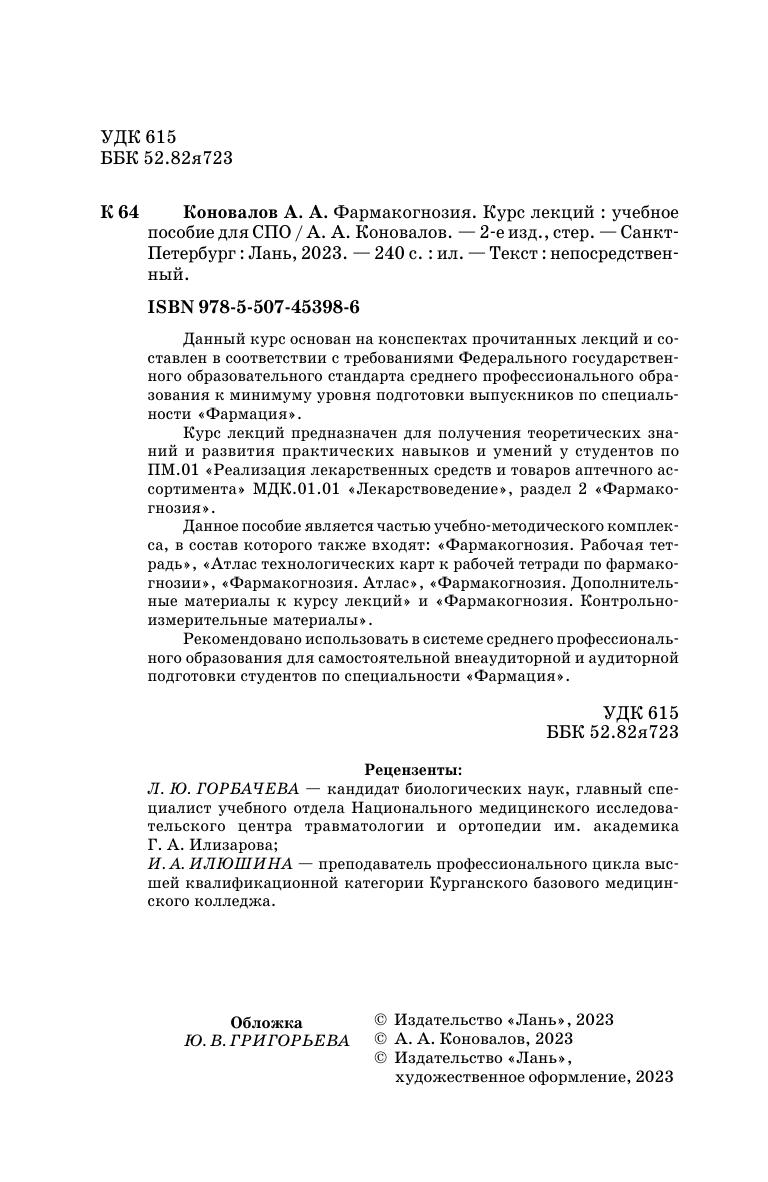 Данный курс основан на конспектах прочитанных лекций и составлен в соответствии с требованиями Федерального государственного образовательного стандарта среднего профессионального образования к минимуму уровня подготовки выпускников по специальности «Фармация». Курс лекций предназначен для получения теоретических знаний и развития практических навыков и умений у студентов по ПМ.01 «Реализация лекарственных средств и товаров аптечного ассортимента» МДК.01.01 «Лекарствоведение», раздел 2 «Фармакогнозия». Данное пособие является частью учебно-методического комплекса, в состав которого также входят: «Фармакогнозия. Рабочая тетрадь», «Атлас технологических карт к рабочей тетради по фармакогнозии», «Фармакогнозия. Атлас», «Фармакогнозия. Дополнительные материалы к курсу лекций» и «Фармакогнозия. Контрольно-измерительные материалы». Соответствует современным требованиям Федерального государственного образовательного стандарта среднего профессионального образования и профессиональным квалификационным требованиям. Рекомендовано использовать в системе среднего профессионального образования для самостоятельной внеаудиторной и аудиторной подготовки студентов по специальности «Фармация».