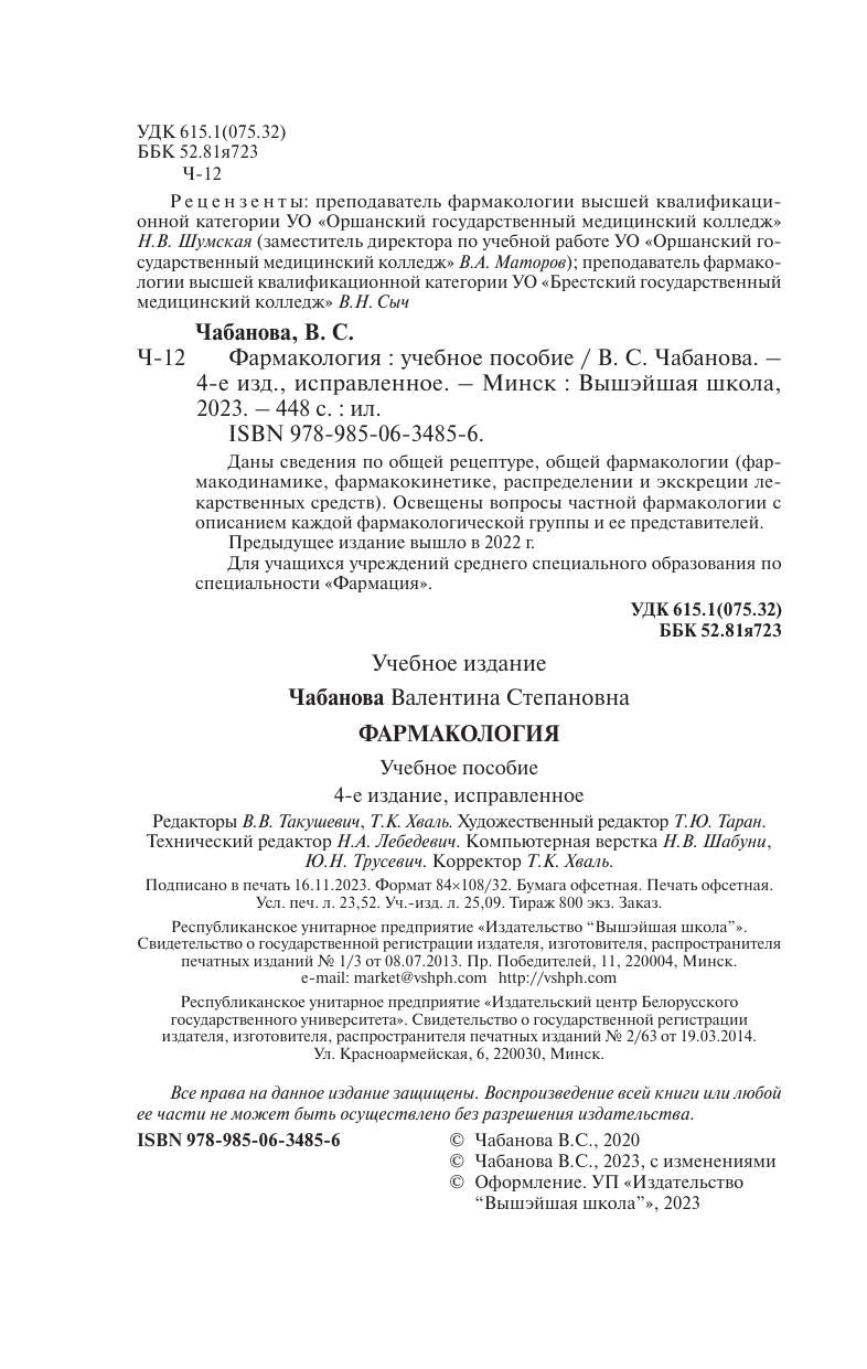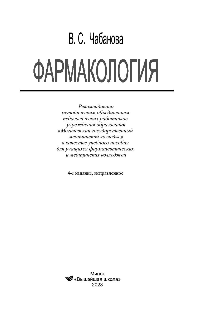 Даны сведения по общей рецептуре, общей фармакологии (фармакодинамике, фармакокинетике, распределении и экскреции лекарственных средств). Освещены вопросы частной фармакологии с описанием каждой фармакологической группы и ее представителей. Предыдущее издание вышло в 2022 г. Для учащихся учреждений среднего специального образования по специальности «Фармация».