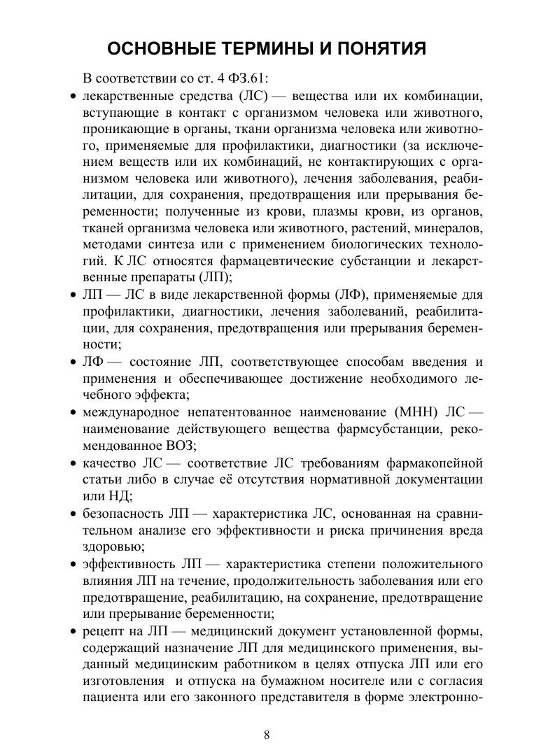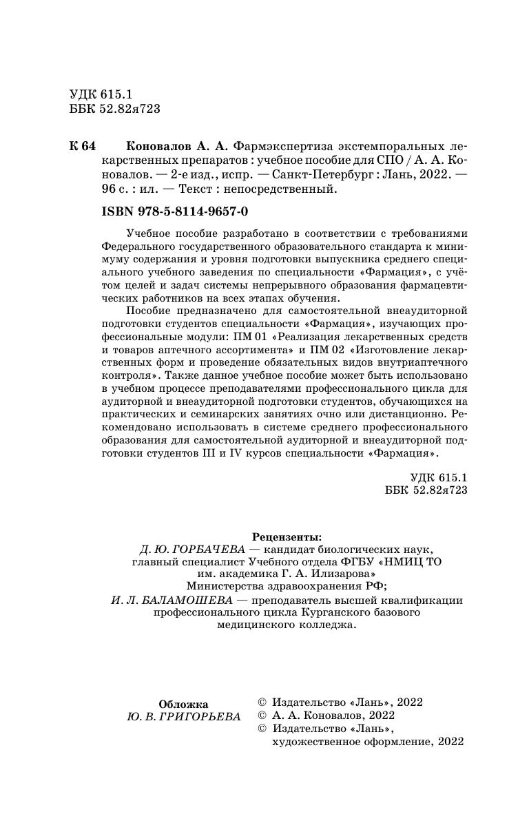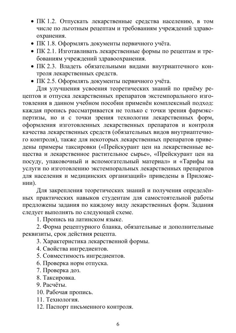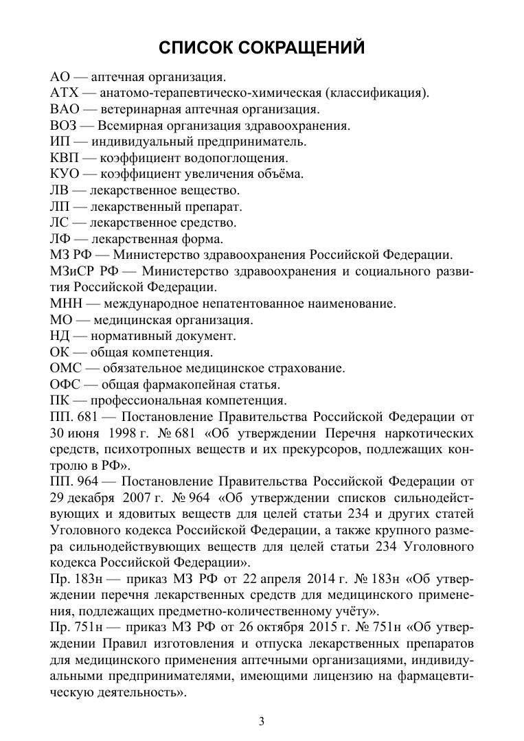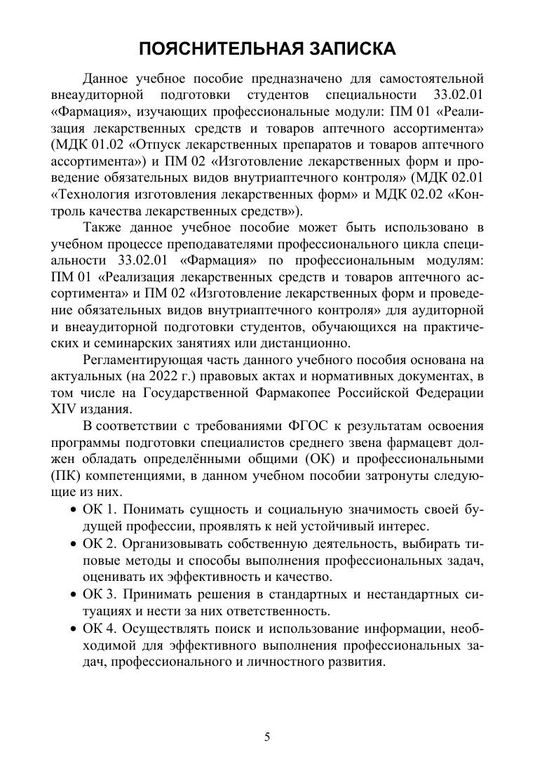 Учебное пособие разработано в соответствии с требованиями федерального государственного образовательного стандарта к минимуму содержания и уровня подготовки выпускника среднего специального учебного заведения по специальности «Фармация», с учётом целей и задач системы непрерывного образования фармацевтических работников на всех этапах обучения. Пособие предназначено для самостоятельной внеаудиторной подготовки студентов специальности «Фармация», изучающих профессиональные модули: ПМ.01 «Реализация лекарственных средств и товаров аптечного ассортимента» и ПМ.02 «Изготовление лекарственных форм и проведение обязательных видов внутриаптечного контроля». Также данное учебное пособие может быть использовано в учебном процессе преподавателями профессионального цикла для аудиторной и внеаудиторной подготовки студентов обучающихся на практических и семинарских занятиях очно или дистанционно. Рекомендовано использовать в системе среднего профессионального образования для самостоятельной аудиторной и внеаудиторной подготовки студентов III и IV курсов специальности «Фармация».
