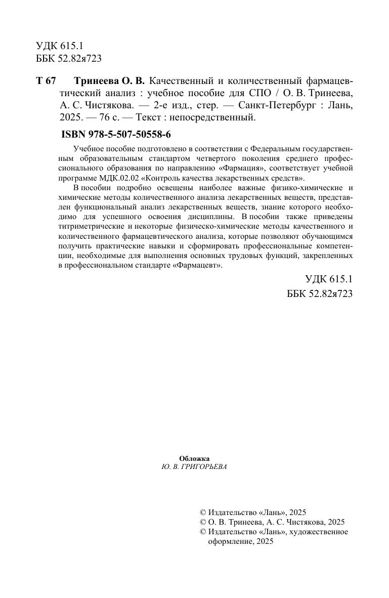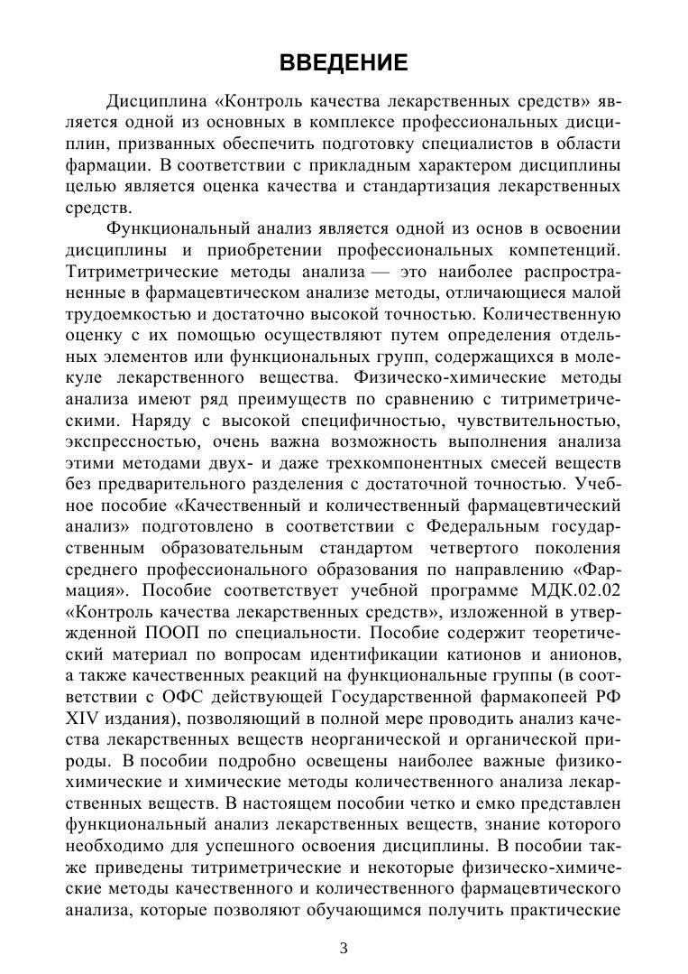 Учебное пособие подготовлено в соответствии с Федеральным государственным образовательным стандартом четвертого поколения среднего профессионального образования по направлению «Фармация», соответствует учебной программе МДК.02.02 «Контроль качества лекарственных средств». В пособии подробно освещены наиболее важные физико-химические и химические методы количественного анализа лекарственных веществ, представлен функциональный анализ лекарственных веществ, значение которого необходимо для успешного освоения дисциплины. В пособии также приведены титриметрические и некоторые физическо-химические методы качественного и количественного фармацевтического анализа, которые позволяют обучающимся получить практические навыки и сформировать профессиональные компетенции, необходимые для выполнения основных трудовых функций, закрепленных в профессиональном стандарте «Фармацевт».