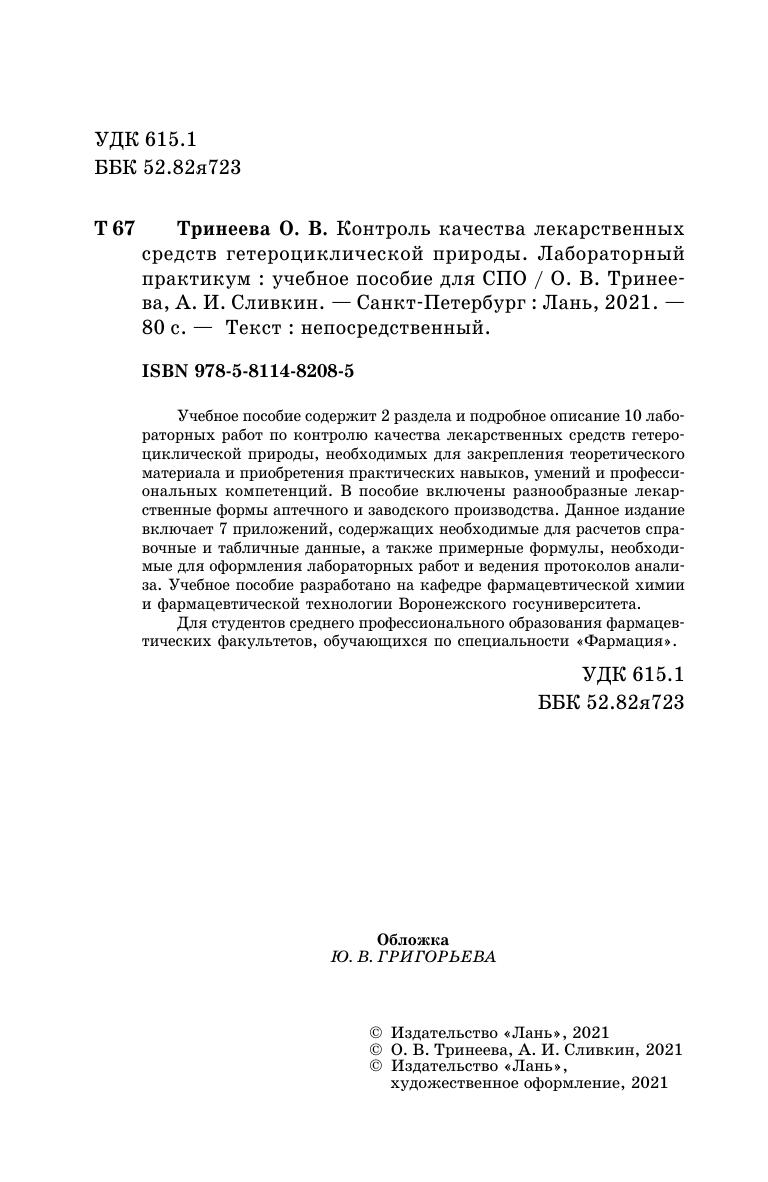 Учебное пособие содержит 2 раздела и подробное описание 10 лабораторных работ по контролю качества лекарственных средств гетероциклической природы, необходимых для закрепления теоретического материала и приобретения практических навыков, умений и профессиональных компетенций. В пособие включены разнообразные лекарственные формы аптечного и заводского производства. Данное издание включает 7 приложений, содержащих необходимые для расчетов справочные и табличные данные, а также примерные формулы, необходимые для оформления лабораторных работ и ведения протоколов анализа. Учебное пособие разработано на кафедре фармацевтической химии и фармацевтической технологии Воронежского госуниверситета.