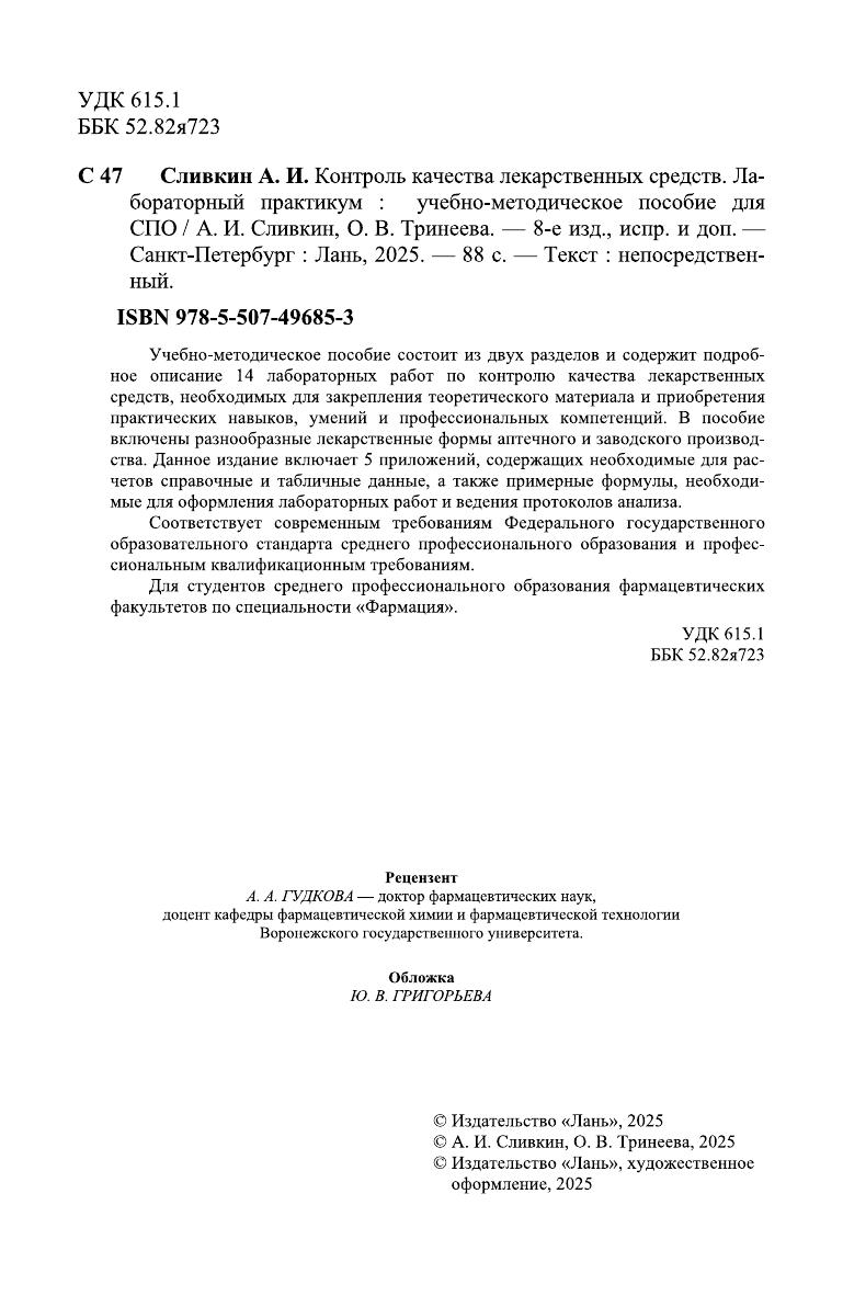 Учебно-методическое пособие состоит из двух разделов и содержит подробное описание 14 лабораторных работ по контролю качества лекарственных средств, необходимых для закрепления теоретического материала и приобретения практических навыков, умений и профессиональных компетенций. В пособие включены разнообразные лекарственные формы аптечного и заводского производства. Данное издание включает 5 приложений, содержащих необходимые для расчетов справочные и табличные данные, а также примерные формулы, необходимые для оформления лабораторных работ и ведения протоколов анализа. Соответствует современным требованиям Федерального государственного образовательного стандарта среднего профессионального образования и профессиональным квалификационным требованиям. Для студентов среднего профессионального образования фармацевтических факультетов по специальности «Фармация».
