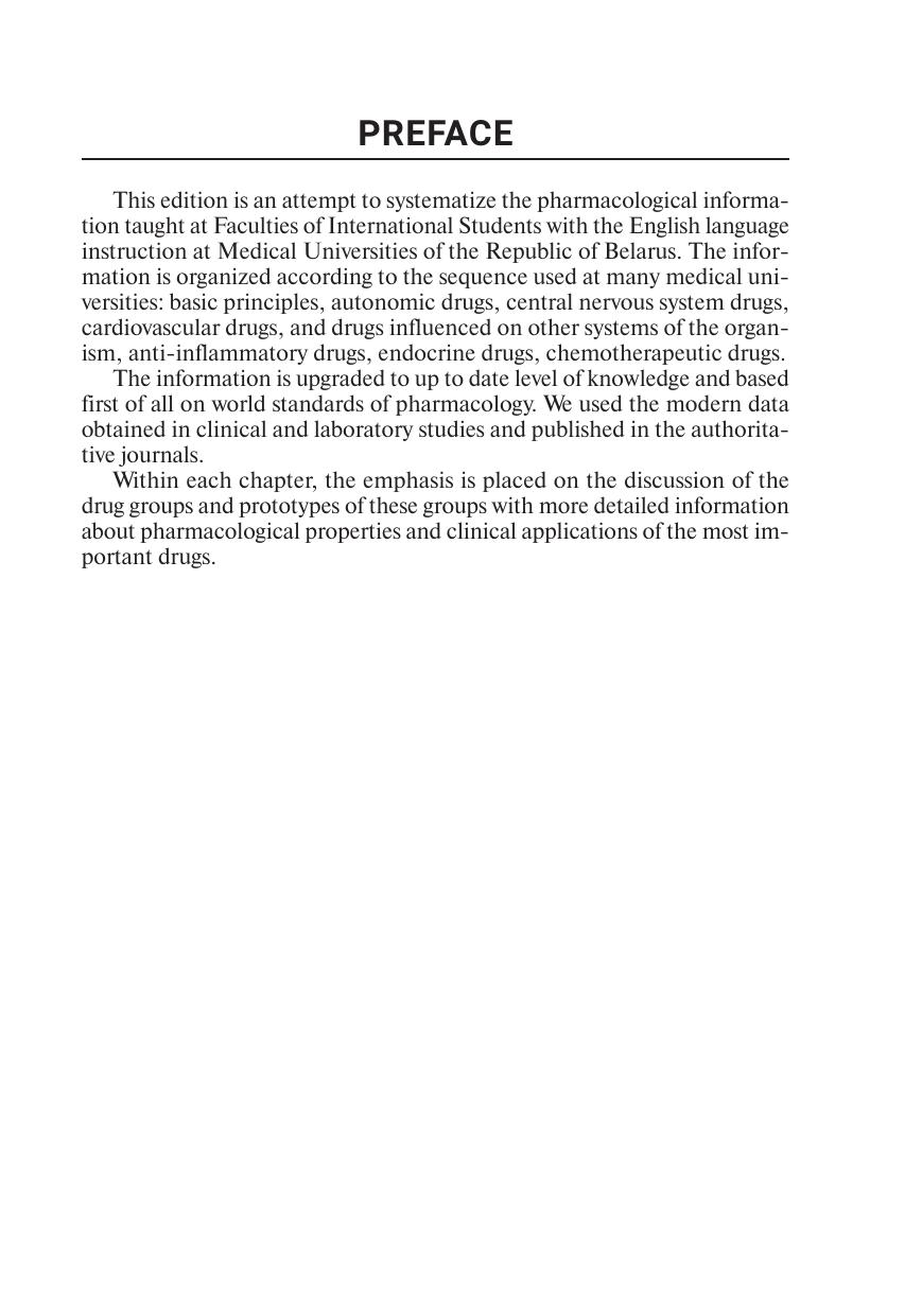 Учебное пособие представляет собой систематизированную информацию по основным разделам фармакологии: общей фармакологии, нейротропным средствам, средствам, влияющим на функции сердечно-сосудистой, дыхательной и других систем организма, химиотерапевтическим средствам. В пособии даются основные аспекты фармакодинамики и фармакокинетики лекарственных средств, их применения в клинике. Для иностранных студентов учреждений высшего образования по специальностям «Лечебное дело», «Педиатрия».