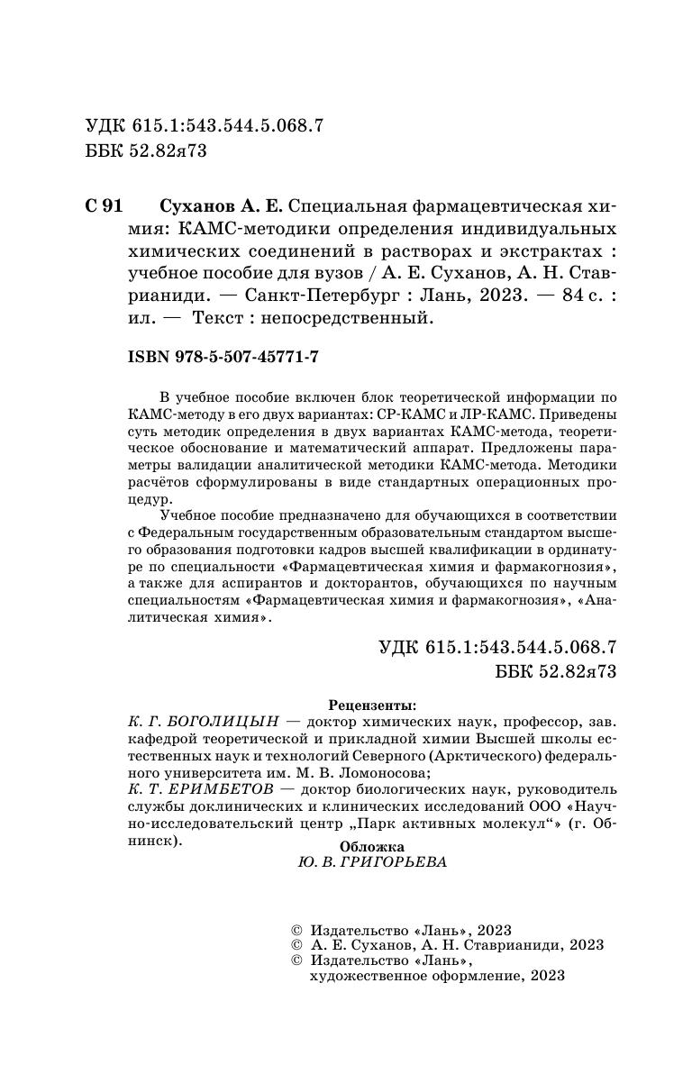 В учебное пособие включен блок теоретической информации по КАМС-методу в его двух вариантах: СР-КАМС и ЛР-КАМС. Приведены суть методик определения в двух вариантах КАМС-метода, теоретическое обоснование и математический аппарат. Предложены параметры валидации аналитической методики КАМС-метода. Методики расчётов сформулированы в виде стандартных операционных процедур. Учебное пособие предназначено для обучающихся в соответствии с Федеральным государственным образовательным стандартом высшего образования подготовки кадров высшей квалификации в ординатуре по специальности «Фармацевтическая химия и фармакогнозия», а также для аспирантов и докторантов, обучающихся по научным специальностям «Фармацевтическая химия и фармакогнозия», «Аналитическая химия».