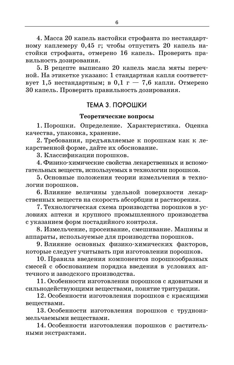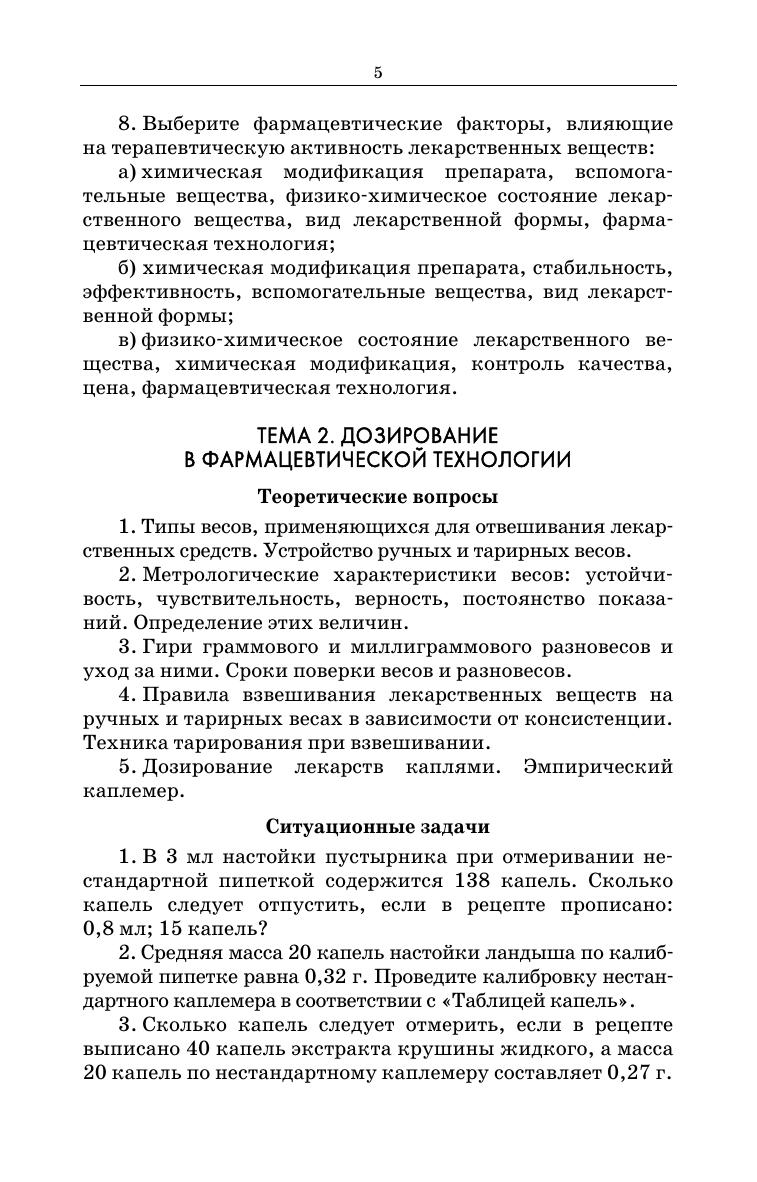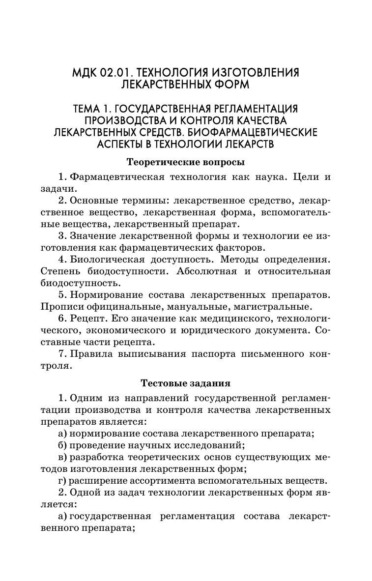 В пособии представлены вопросы для теоретической проработки изучаемых тем, рецепты и ситуационные задачи, а также расчетные задания и тесты для самоконтроля знаний, полученных в процессе изучения предлагаемого материала по производству и изготовлению лекарственных форм.