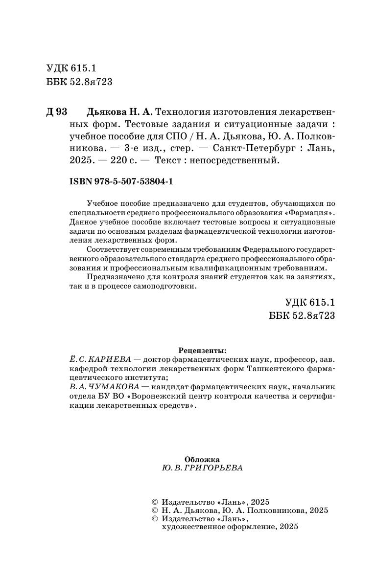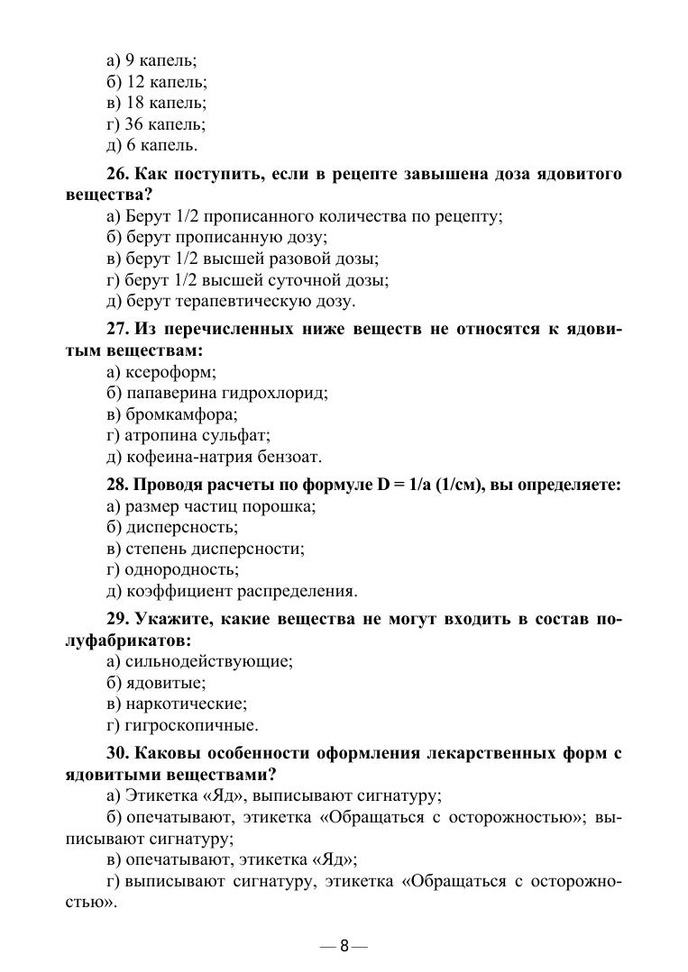 Учебное пособие предназначено для студентов, обучающихся по специальности среднего профессионального образования «Фармация». Данное учебное пособие включает тестовые вопросы и ситуационные задачи по основным разделам фармацевтической технологии изготовления лекарственных форм. Соответствует современным требованиям Федерального государственного образовательного стандарта среднего профессионального образования и профессиональным квалификационным требованиям. Предназначено для контроля знаний студентов, как на занятиях, так и в процессе самоподготовки.
