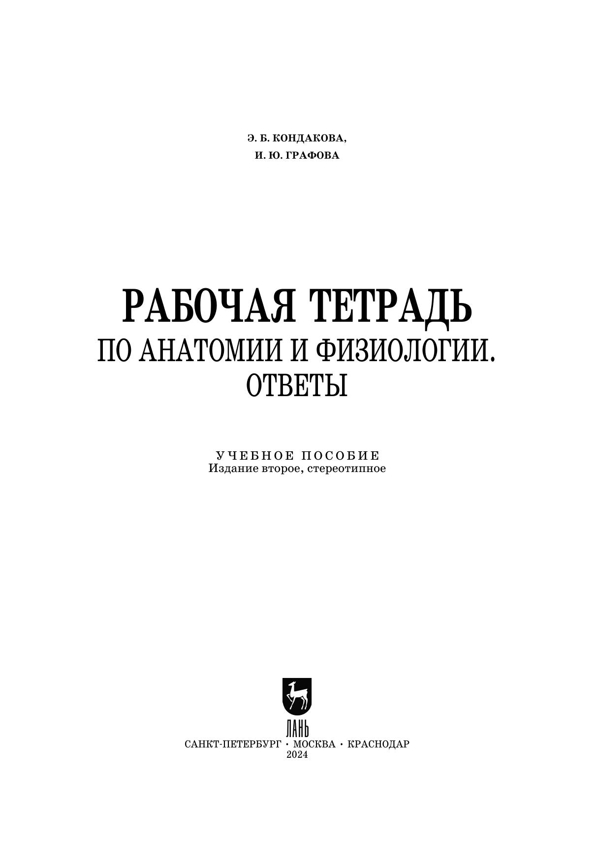 Предлагаемые эталоны ответов к Рабочей тетради по анатомии и физиологии созданы в помощь преподавателям и студентам специальностей: «Лечебное дело», «Сестринское дело», «Акушерское дело», «Сестринское дело» (очно-заочная форма обучения). Материал структурирован в соответствии с требованиями Федерального Государственного образовательного стандарта СПО и учебной программой по анатомии и физиологии человека. Задания посвящены общим вопросам нормальной анатомии человека, анатомии опорно-двигательного аппарата, анатомии пищеварительной, дыхательной, эндокринной, иммунной систем, мочеполового аппарата, центральной нервной системы, органов чувств, сердечно-сосудистой и периферической нервной систем. Рабочая тетрадь имеет целью помочь обучающимся сформировать знания и умения по анатомии человека, как организма в целом, так и отдельных органов и систем и использовать полученные знания при последующем изучении других фундаментальных и клинических дисциплин, а также в будущей профессиональной деятельности. Тетрадь содержит ответы к заданиям для систематизирования материала по анатомии, который может быть дополнен студентом с использованием любого доступного учебника анатомии соответствующего уровня.