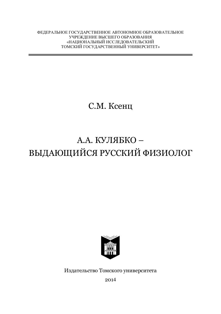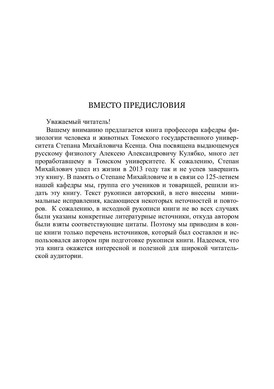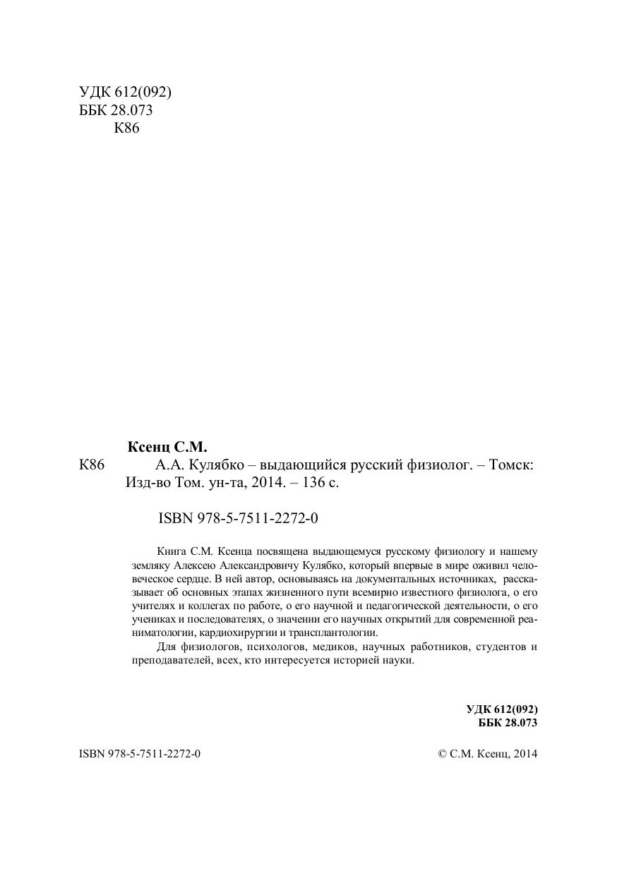 Книга С.М. Ксенца посвящена выдающемуся русскому физиологу и нашему земляку Алексею Александровичу Кулябко, который впервые в мире оживил человеческое сердце. В ней автор, основываясь на документальных источниках, рассказывает об основных этапах жизненного пути всемирно известного физиолога, о его учителях и коллегах по работе, о его научной и педагогической деятельности, о его учениках и последователях, о значении его научных открытий для современной реаниматологии, кардиохирургии и трансплантологии. Для физиологов, психологов, медиков, научных работников, студентов и преподавателей, всех, кто интересуется историей науки.