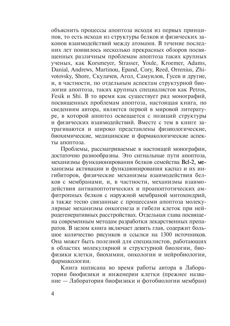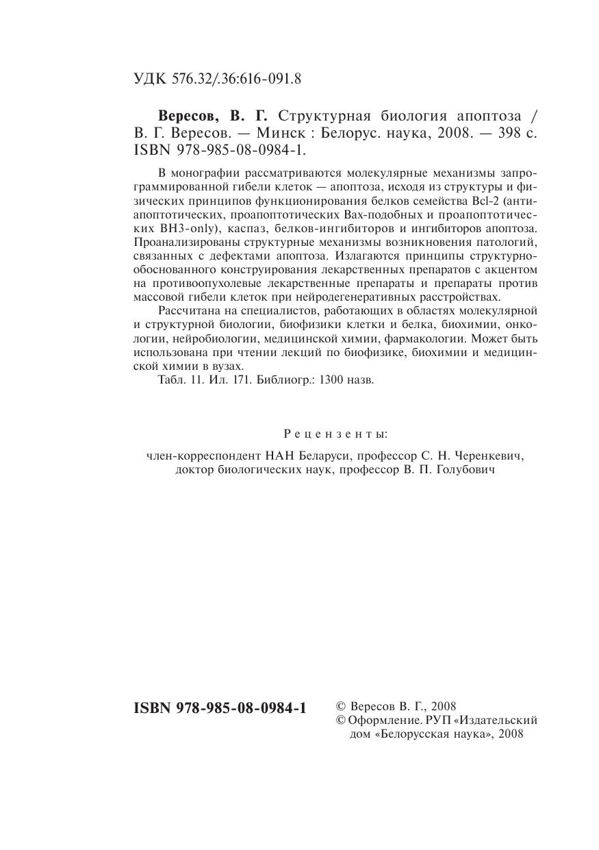 В монографии рассматриваются молекулярные механизмы запрограммированной гибели клеток — апоптоза, исходя из структуры и физических принципов функционирования белков семейства Bcl-2 (анти- апоптотических, проапоптотических Bax-подобных и проапоптотичес- ких BH3-only), каспаз, белков-ингибиторов и ингибиторов апоптоза. Проанализированы структурные механизмы возникновения патологий, связанных с дефектами апоптоза. Излагаются принципы структурнообоснованного конструирования лекарственных препаратов с акцентом на противоопухолевые лекарственные препараты и препараты против массовой гибели клеток при нейродегенеративных расстройствах. Рассчитана на специалистов, работающих в областях молекулярной и структурной биологии, биофизики клетки и белка, биохимии, онкологии, нейробиологии, медицинской химии, фармакологии. Может быть использована при чтении лекций по биофизике, биохимии и медицинской химии в вузах.