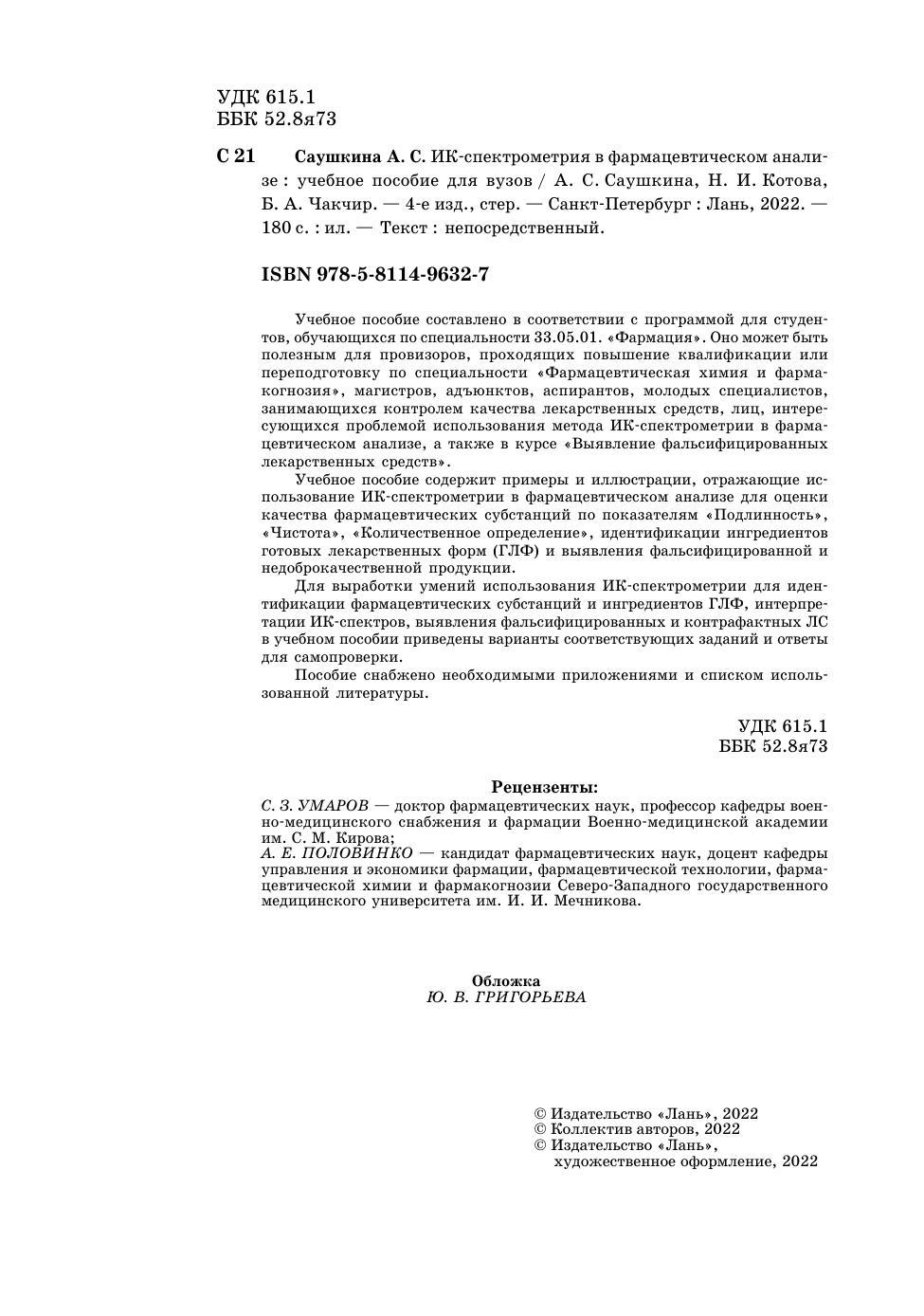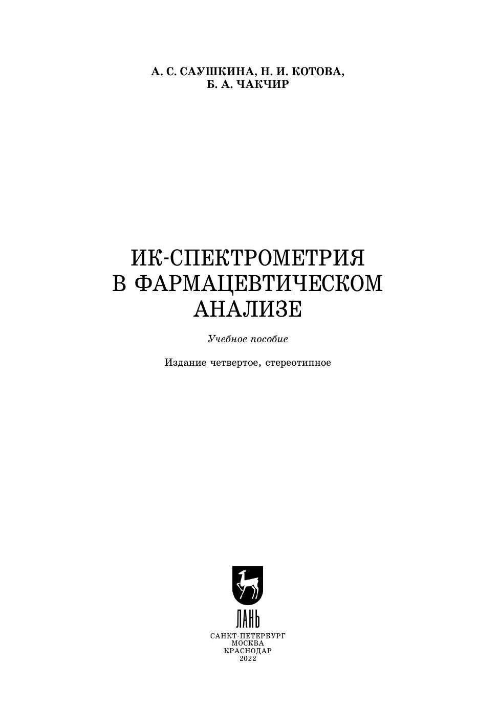 Учебное пособие составлено в соответствии с программой для студентов, обучающихся по специальности 33.05.01. «Фармация». Оно может быть полезным для провизоров, проходящих повышение квалификации или пере-подготовку по специальности «Фармацевтическая химия и фармакогнозия», магистров, адъюнктов, аспирантов, молодых специалистов, занимающихся контролем качества лекарственных средств, лиц, интересующихся проблемой использования метода ИК-спектрометрии в фармацевтическом анализе, а также в курсе «Выявление фальсифицированных лекарственных средств».