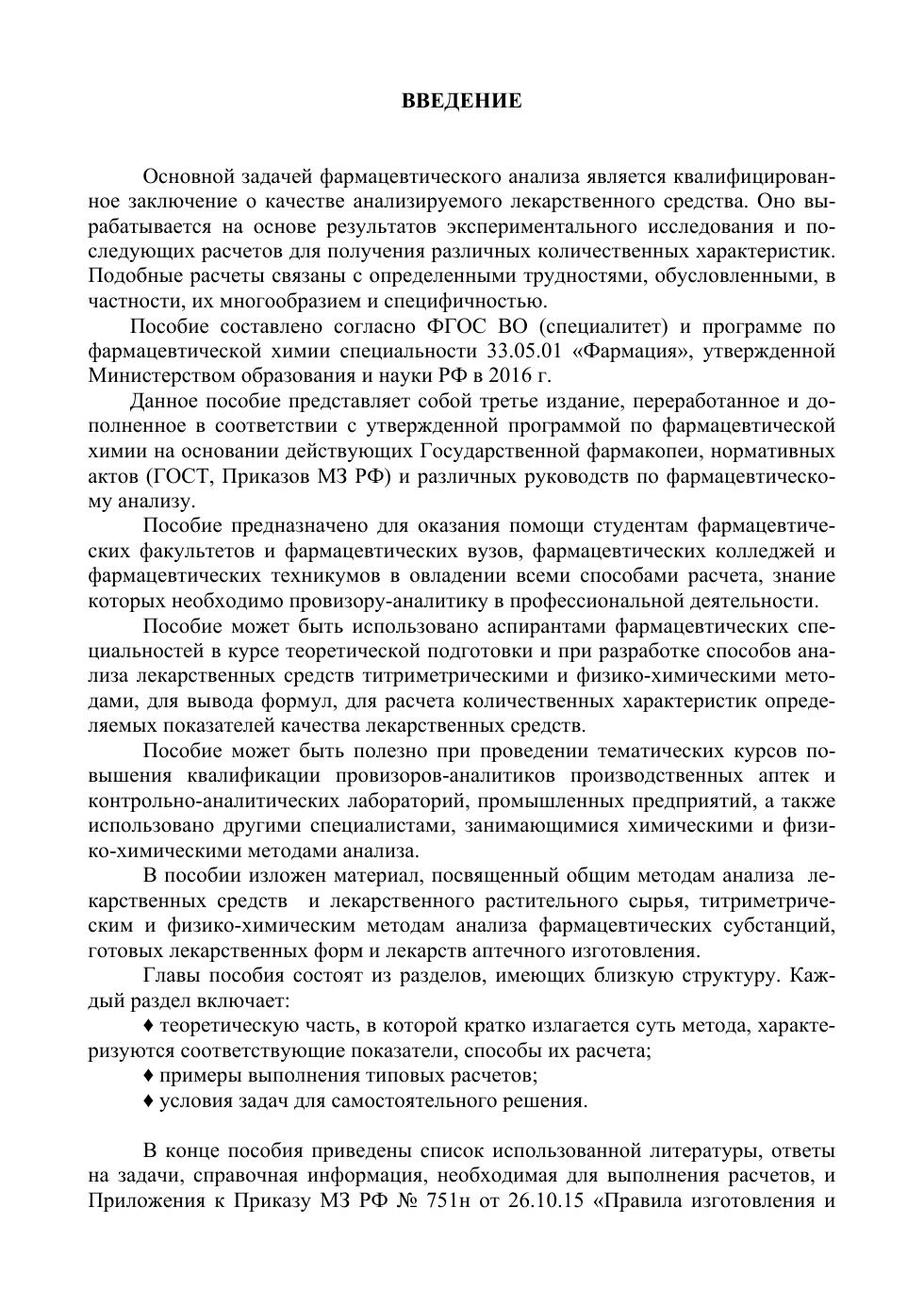 В пособии подробно рассматриваются примеры выполнения типовых расчетов, охватывающие практически все стороны деятельности провизора-аналитика по контролю качества лекарственных средств. Для выработки и закрепления навыков расчета в пособии приведены задачи для самостоятельного решения и ответы на них для самопроверки. Подбор задач позволяет освоить способы расчета, используемые в химических и физико-химических методах анализа, включенных в действующую нормативную документацию.