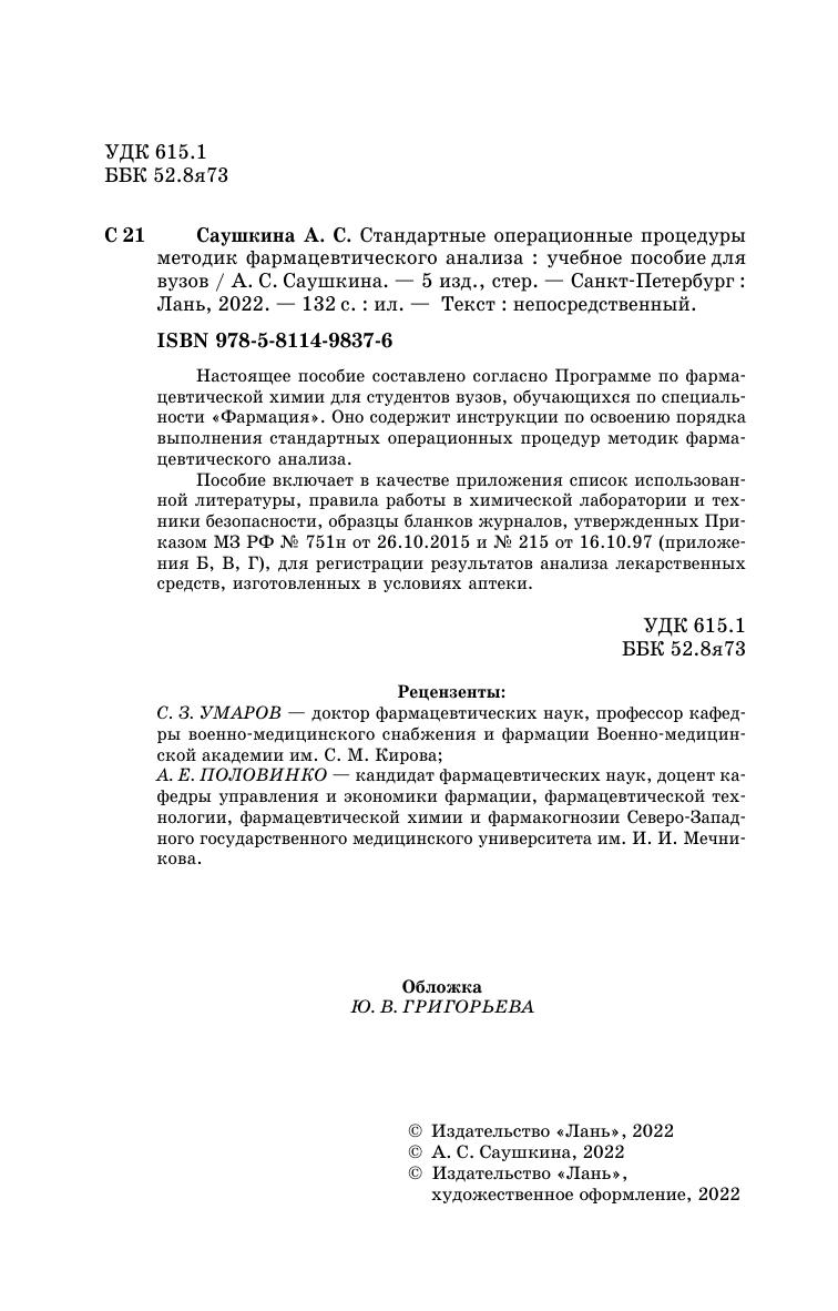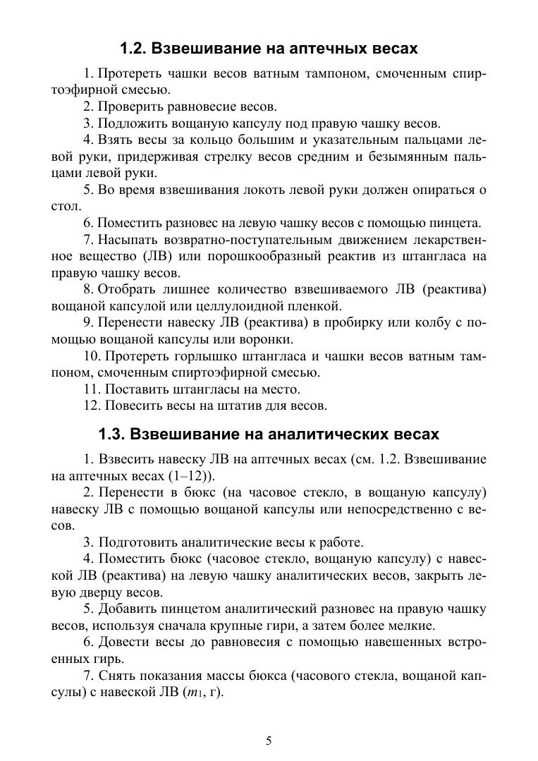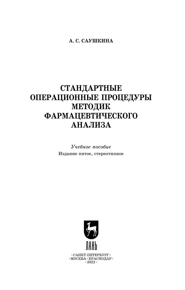 Настоящее пособие составлено согласно Программе по фармацевтической химии для студентов, обучающихся по специальности «Фармация». Оно содержит инструкции по освоению порядка выполнения стандартных операционных процедур методик фармацевтического анализа. Пособие включает в качестве приложения список использованной литературы, правила работы в химической лаборатории и техники безопасности, образцы бланков журналов, утвержденных приказом МЗ РФ № 751н от 26.10.2015 и № 215 от 16.10.97 (приложения Б, В, Г), для регистрации результатов анализа лекарственных средств, изготовленных в условиях аптеки.