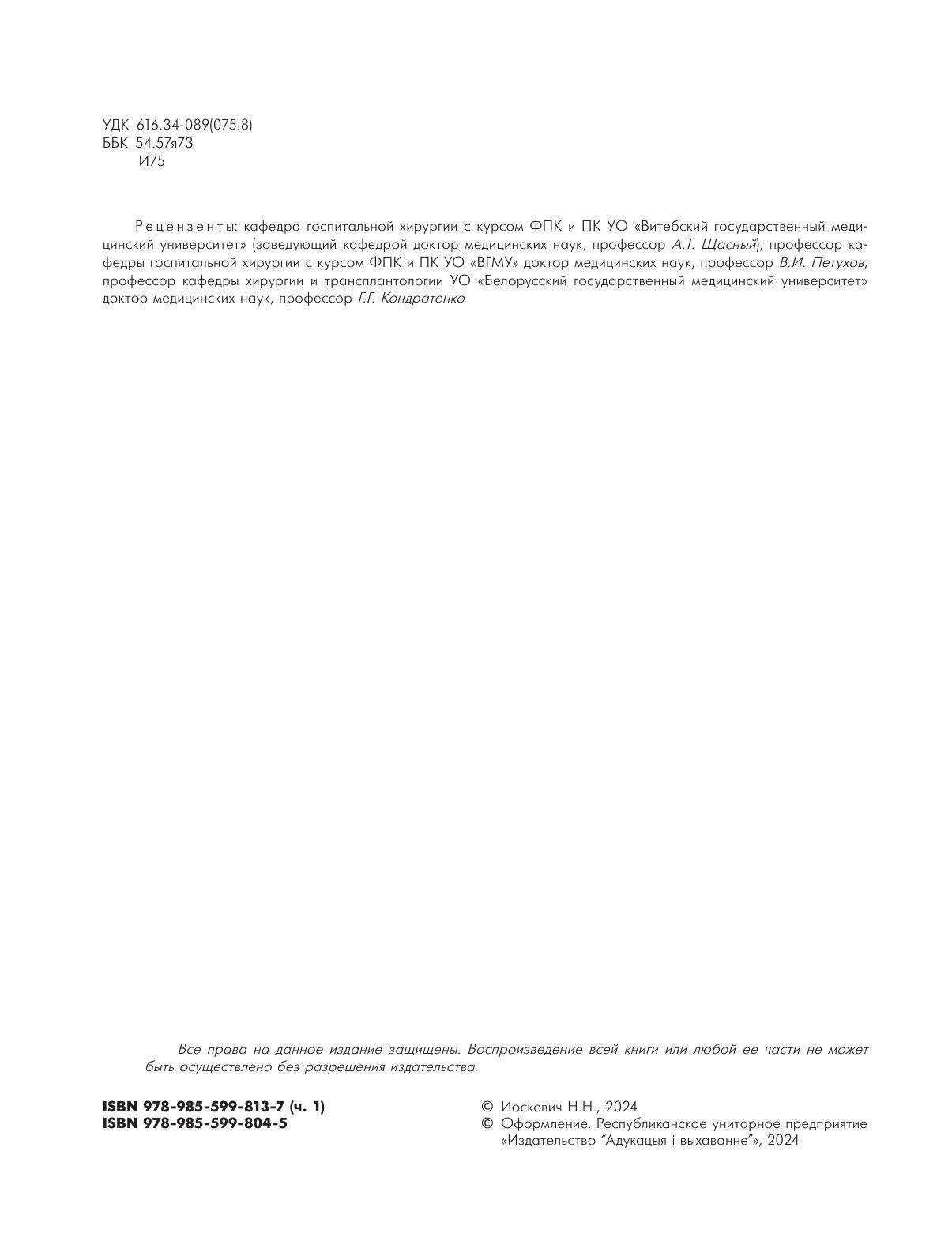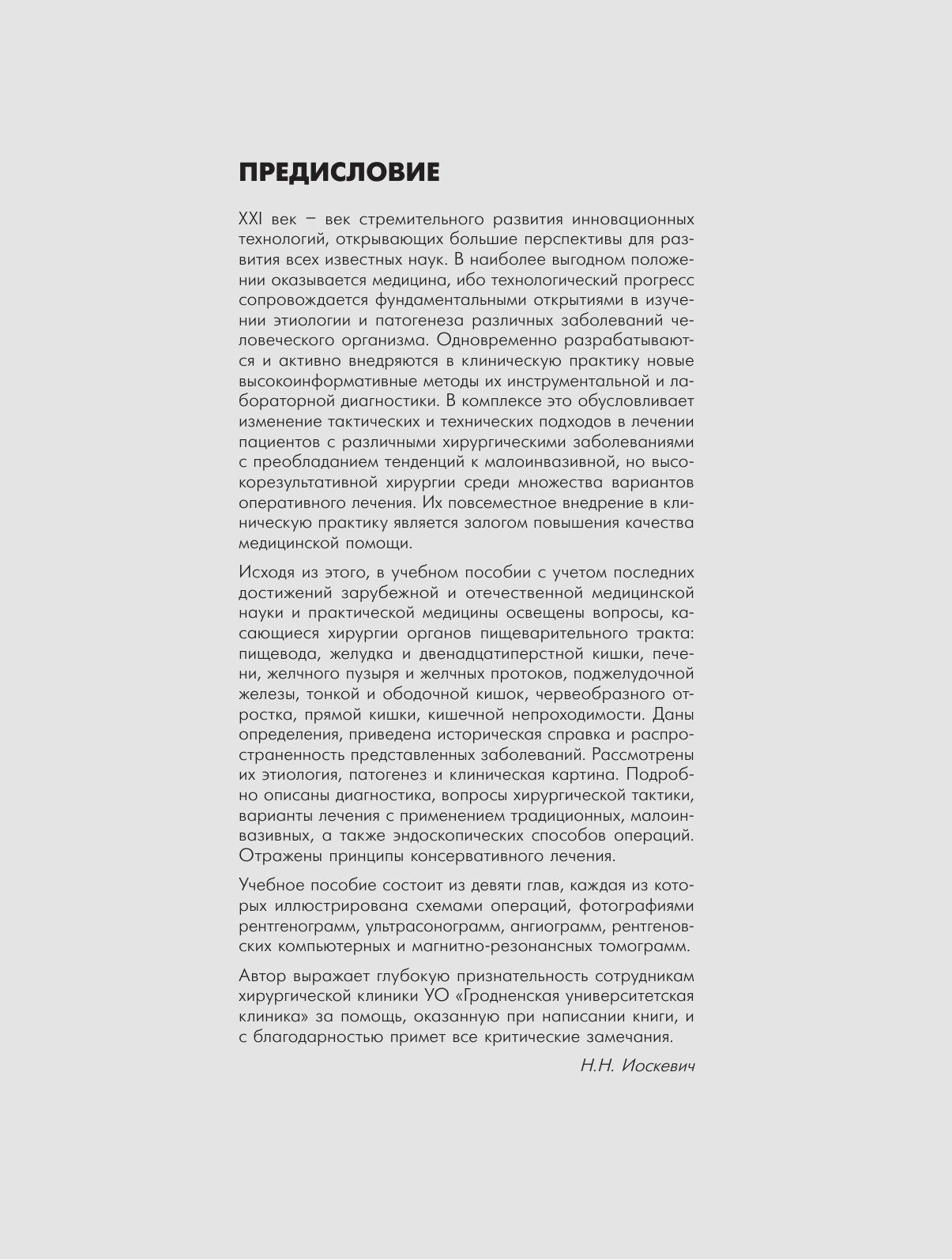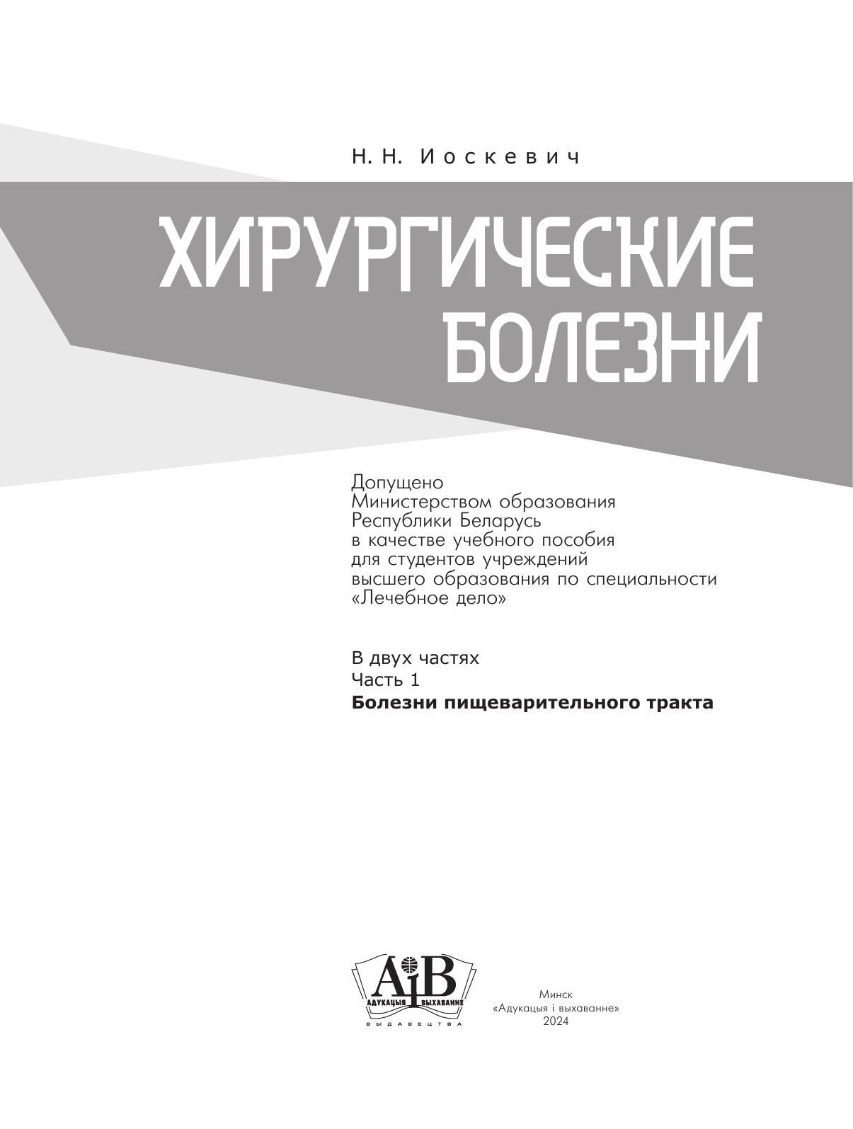 В учебном пособии с современных позиций освещены этиология, патогенез, клиническая картина заболеваний пищеварительного тракта. Рассмотрены их диагностика, вопросы хирургической тактики, принципы консервативного лечения и предоперационной подготовки. Изложены показания к оперативным вмешательствам с применением традиционных и малоинвазивных методов, варианты операций, послеоперационное ведение пациентов, результаты лечения. Предназначено для студентов 4–6-го курсов учреждений высшего образования по специальности «Лечебное дело», интернов по специальности «Хирургия», молодых хирургов, будет полезно врачам-интернам по специальностям «Терапия», «Общая врачебная практика».