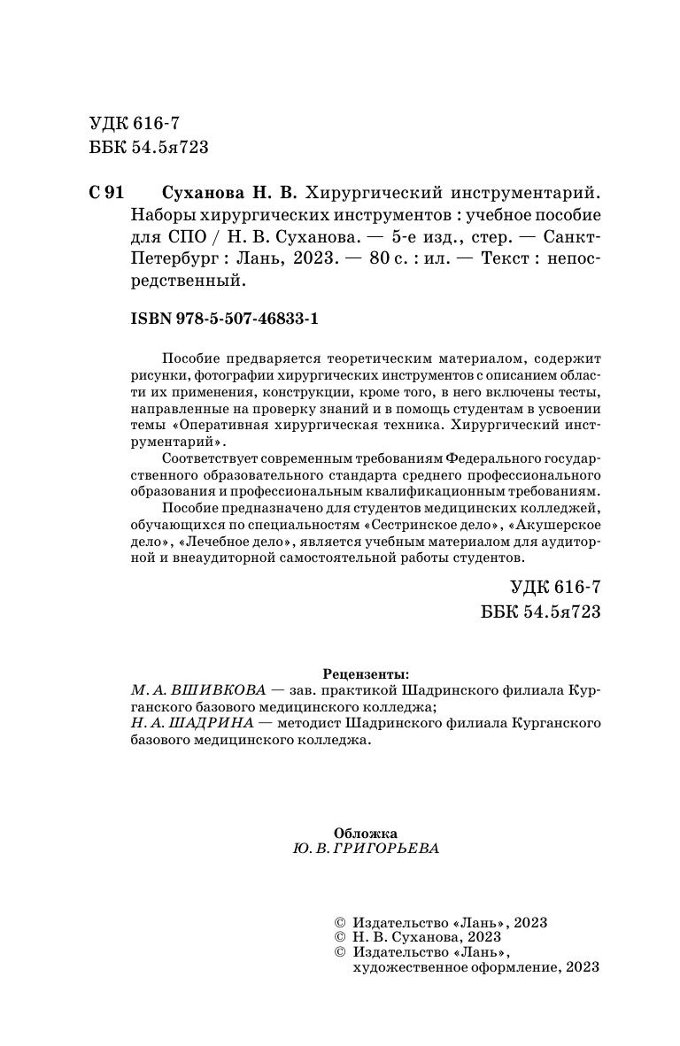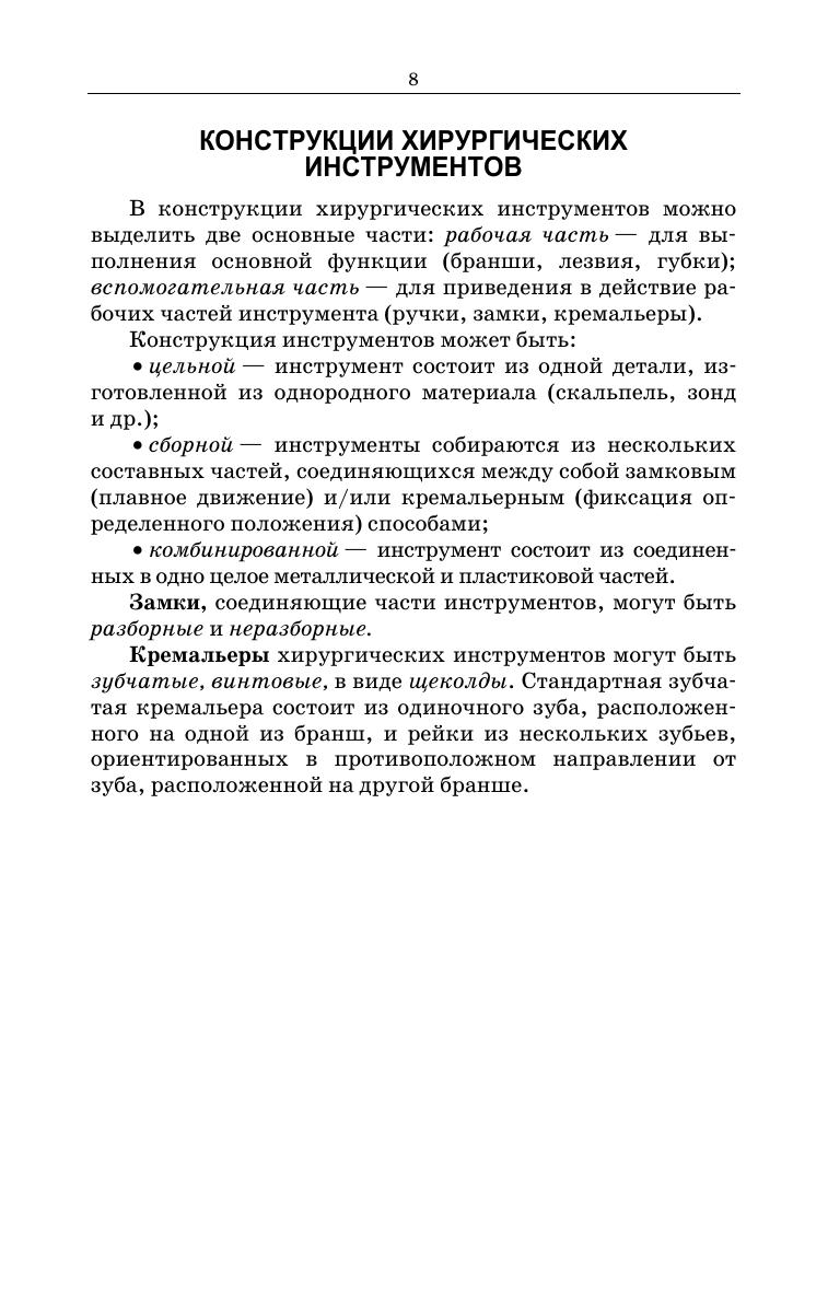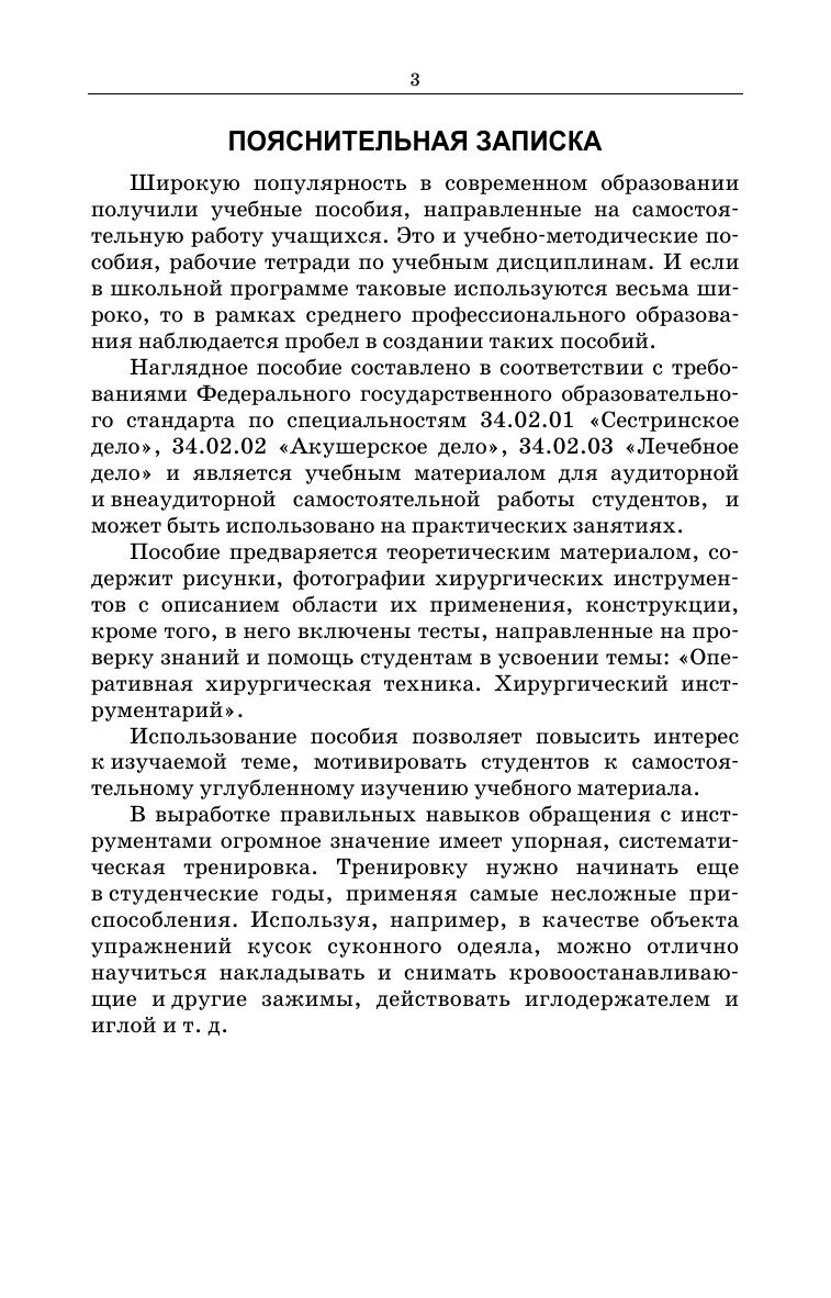 Пособие предваряется теоретическим материалом, содержит рисунки, фотографии хирургических инструментов с описанием области их применения, конструкции, кроме того, в него включены тесты, направленные на проверку знаний и помощь студентам в усвоении темы: «Оперативная хирургическая техника. Хирургический инструментарий». Соответствует современным требованиям Федерального государственного образовательного стандарта среднего профессионального образования и профессиональным квалификационным требованиям. Наглядное пособие предназначено для студентов медицинского колледжа специальностей «Сестринское дело», «Акушерское дело», «Лечебное дело», является учебным материалом для аудиторной и внеаудиторной самостоятельной работы студентов.