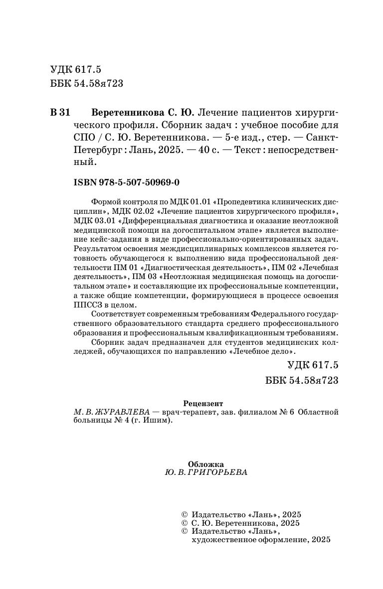 Формой контроля по МДК 02.02 «Лечение пациентов хирургического профиля» является выполнение кейс-задания в виде профессионально-ориентированных задач. Результатом освоения данного междисциплинарного комплекса является готовность обучающегося к выполнению вида профессиональной деятельности ПМ 02 «Лечебная деятельность» и составляющих его профессиональных компетенций, а также общие компетенции, формирующиеся в процессе освоения ОПОП в целом. Соответствует современным требованиям Федерального государственного образовательного стандарта среднего профессионального образования и профессиональным квалификационным требованиям. Сборник задач предназначен для студентов медицинских колледжей, обучающихся по направлению «Лечебное дело».