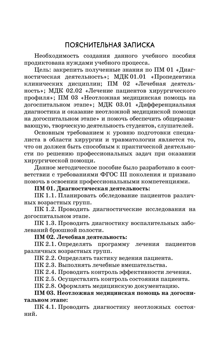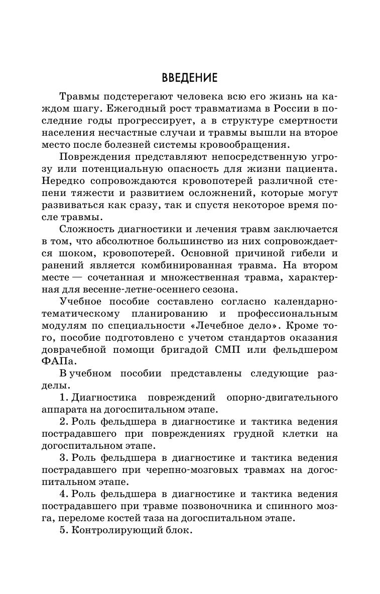 Данное учебное пособие разработано в соответствии с Федеральным государственным образовательным стандартом среднего профессионального образования по специальности Лечебное дело для освоения основного вида профессиональной деятельности и соответствующих профессиональных компетенций согласно должностным инструкциям ПМ 01 Диагностическая деятельность, ПМ 02 Лечебная деятельность, ПМ 03 Неотложная медицинская помощь на догоспитальном этапе. Пособие состоит из 5 разделов и включает в себя рекомендации по диагностике и оказанию доврачебной помощи средним медицинским работником при травмах, а также вопросы для самоконтроля, задания для практических занятий и тесты. Соответствует современным требованиям Федерального государственного образовательного стандарта среднего профессионального образования и профессиональным квалификационным требованиям. Учебное пособие можно применять на практических занятиях и для самостоятельной подготовки студентов медицинских колледжей. Приведенные в пособии данные могут быть полезны практикующим фельдшерам и при обучении на отделении повышения квалификации.