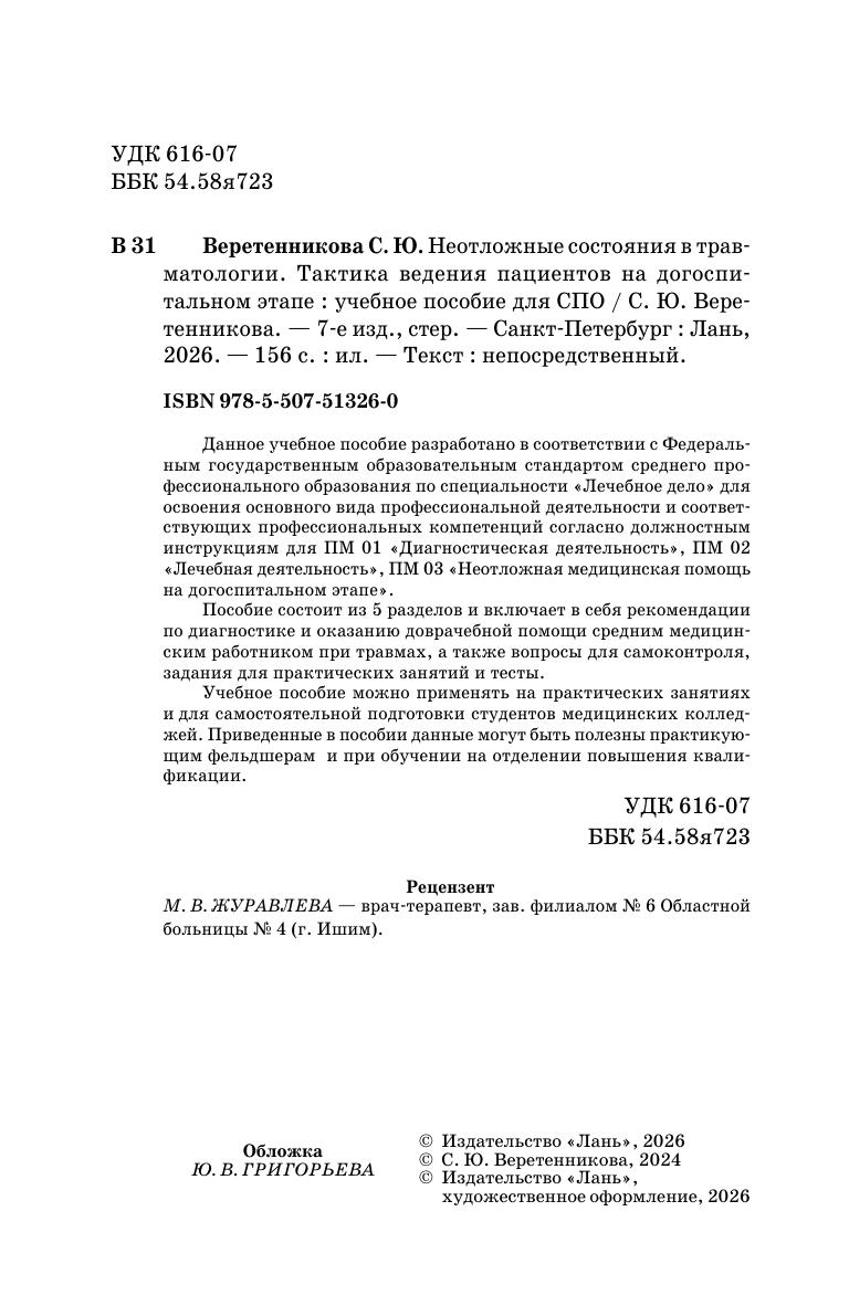 Данное учебное пособие разработано в соответствии с Федеральным государственным образовательным стандартом среднего профессионального образования по специальности Лечебное дело для освоения основного вида профессиональной деятельности и соответствующих профессиональных компетенций согласно должностным инструкциям ПМ 01 Диагностическая деятельность, ПМ 02 Лечебная деятельность, ПМ 03 Неотложная медицинская помощь на догоспитальном этапе. Пособие состоит из 5 разделов и включает в себя рекомендации по диагностике и оказанию доврачебной помощи средним медицинским работником при травмах, а также вопросы для самоконтроля, задания для практических занятий и тесты. Соответствует современным требованиям Федерального государственного образовательного стандарта среднего профессионального образования и профессиональным квалификационным требованиям. Учебное пособие можно применять на практических занятиях и для самостоятельной подготовки студентов медицинских колледжей. Приведенные в пособии данные могут быть полезны практикующим фельдшерам и при обучении на отделении повышения квалификации.