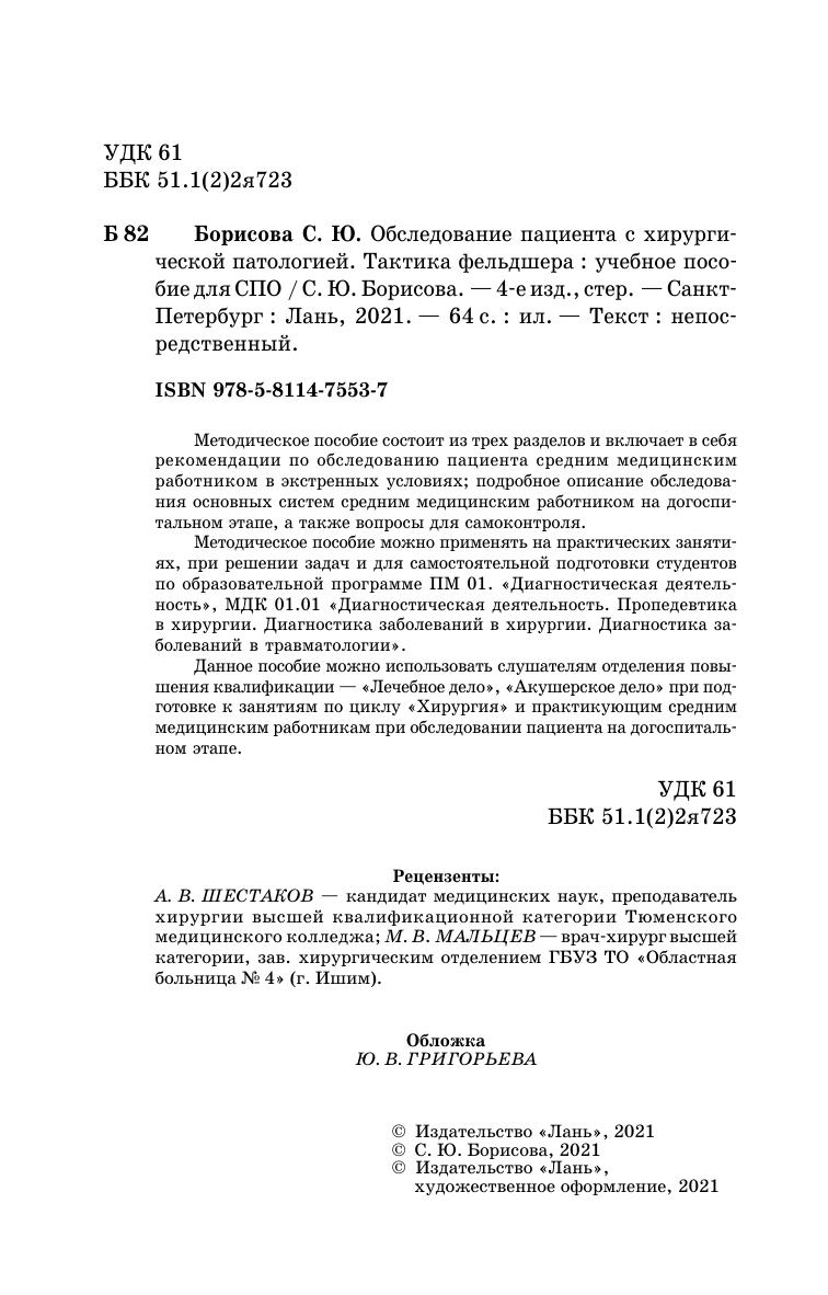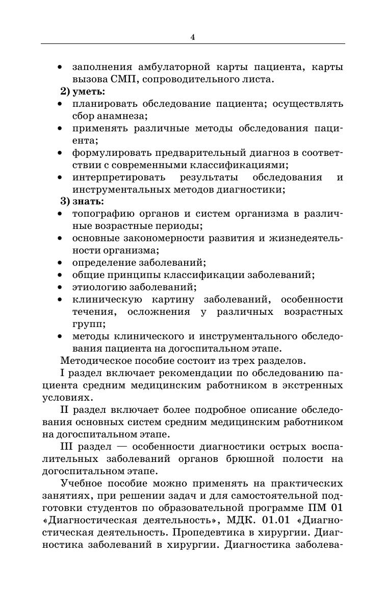 Методическое пособие состоит из трех разделов и включает в себя рекомендации по обследованию пациента средним медицинским работником в экстренных условиях; подробное описание обследования основных систем средним медицинским работником на догоспитальном этапе, а также вопросы для самоконтроля. Методическое пособие можно применять на практических занятиях, при решении задач и для самостоятельной подготовки студентов по образовательной программе ПМ 01. «Диагностическая деятельность», МДК. 01.01. «Диагностическая деятельность. Пропедевтика в хирургии. Диагностика заболеваний в хирургии. Диагностика заболеваний в травматологии». Данное пособие можно использовать слушателям отделения повышения квалификации — «Лечебное дело», «Акушерское дело» при подготовке к занятиям по циклу «Хирургия» и практикующим средним медицинским работникам при обследовании пациента на догоспитальном этапе.