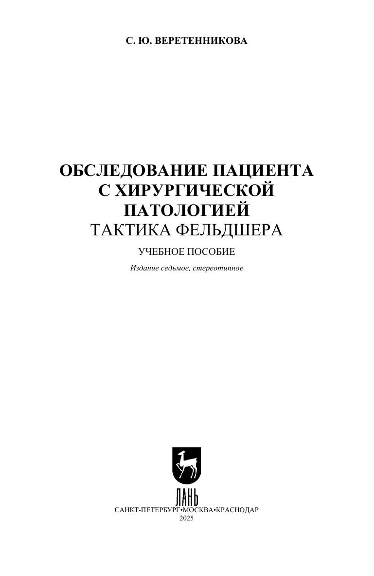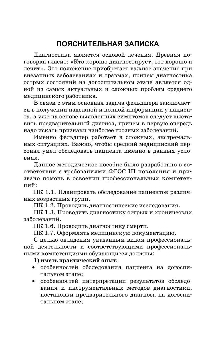 Методическое пособие состоит из трех разделов и включает в себя рекомендации по обследованию пациента средним медицинским работником в экстренных условиях, подробное описание обследования основных систем средним медицинским работником на догоспитальном этапе, а также вопросы для самоконтроля. Методическое пособие можно применять на практических занятиях, при решении задач и для самостоятельной подготовки студентов по образовательной программе ПМ 01. «Диагностическая деятельность», МДК. 01.01. «Диагностическая деятельность. Пропедевтика в хирургии. Диагностика заболеваний в хирургии. Диагностика заболеваний в травматологии». Соответствует современным требованиям Федерального государственного образовательного стандарта среднего профессионального образования и профессиональным квалификационным требованиям. Данное пособие можно использовать слушателям отделения повышения квалификации — «Лечебное дело», «Акушерское дело» при подготовке к занятиям по циклу «Хирургия» и практикующим средним медицинским работникам при обследовании пациента на догоспитальном этапе.