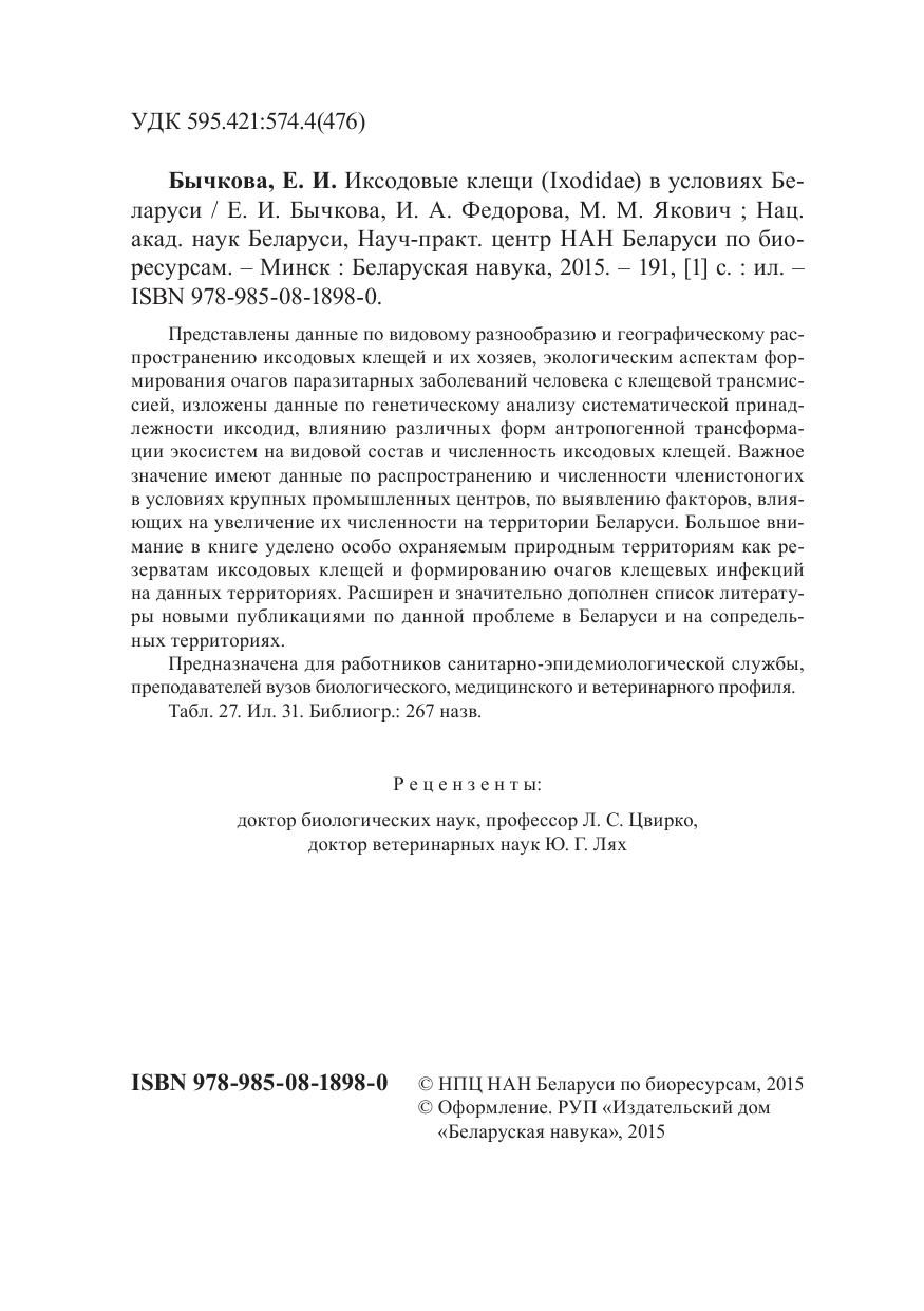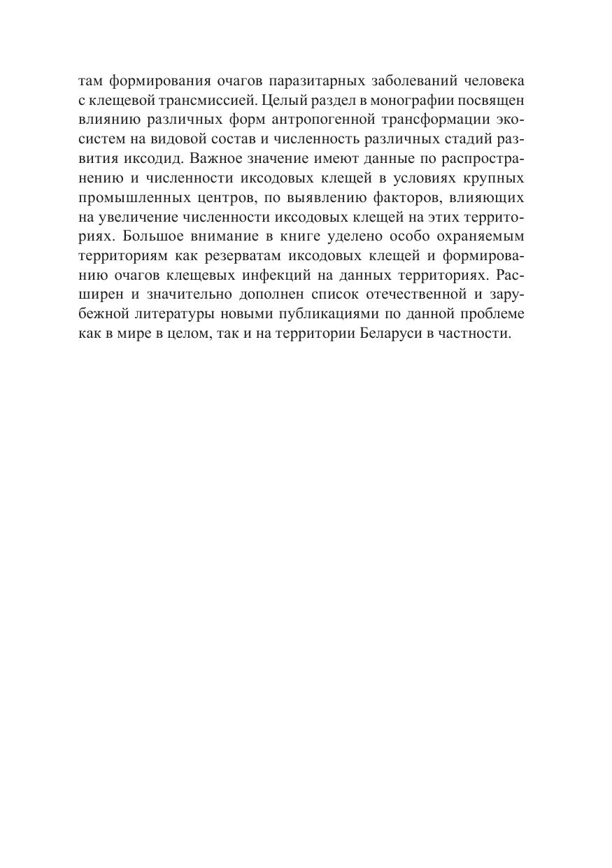 Представлены данные по видовому разнообразию и географическому распространению иксодовых клещей и их хозяев, экологическим аспектам формирования очагов паразитарных заболеваний человека с клещевой трансмиссией, изложены данные по генетическому анализу систематической принадлежности иксодид, влиянию различных форм антропогенной трансформации экосистем на видовой состав и численность иксодовых клещей. Важное значение имеют данные по распространению и численности членистоногих в условиях крупных промышленных центров, по выявлению факторов, влияющих на увеличение их численности на территории Беларуси. Большое внимание в книге уделено особо охраняемым природным территориям как резерватам иксодовых клещей и формированию очагов клещевых инфекций на данных территориях. Расширен и значительно дополнен список литературы новыми публикациями по данной проблеме в Беларуси и на сопредельных территориях. Предназначена для работников санитарно-эпидемиологической службы, преподавателей вузов биологического, медицинского и ветеринарного профиля.