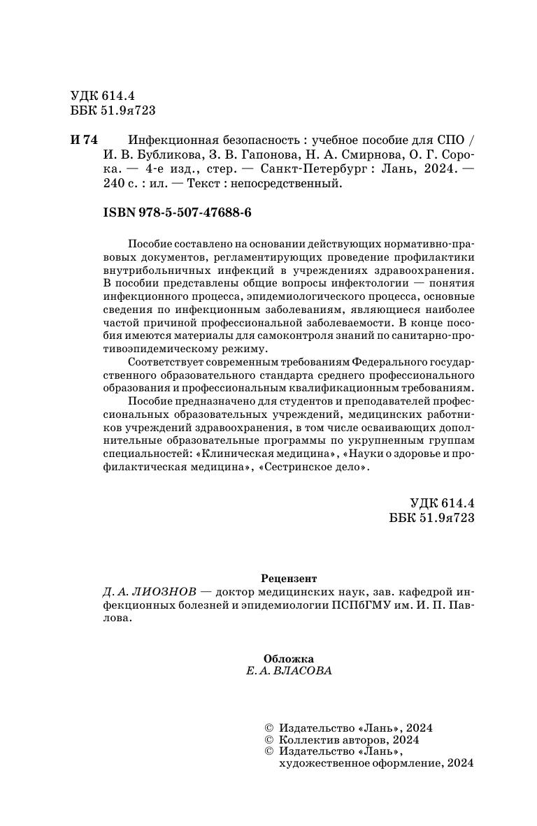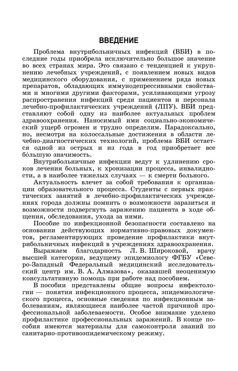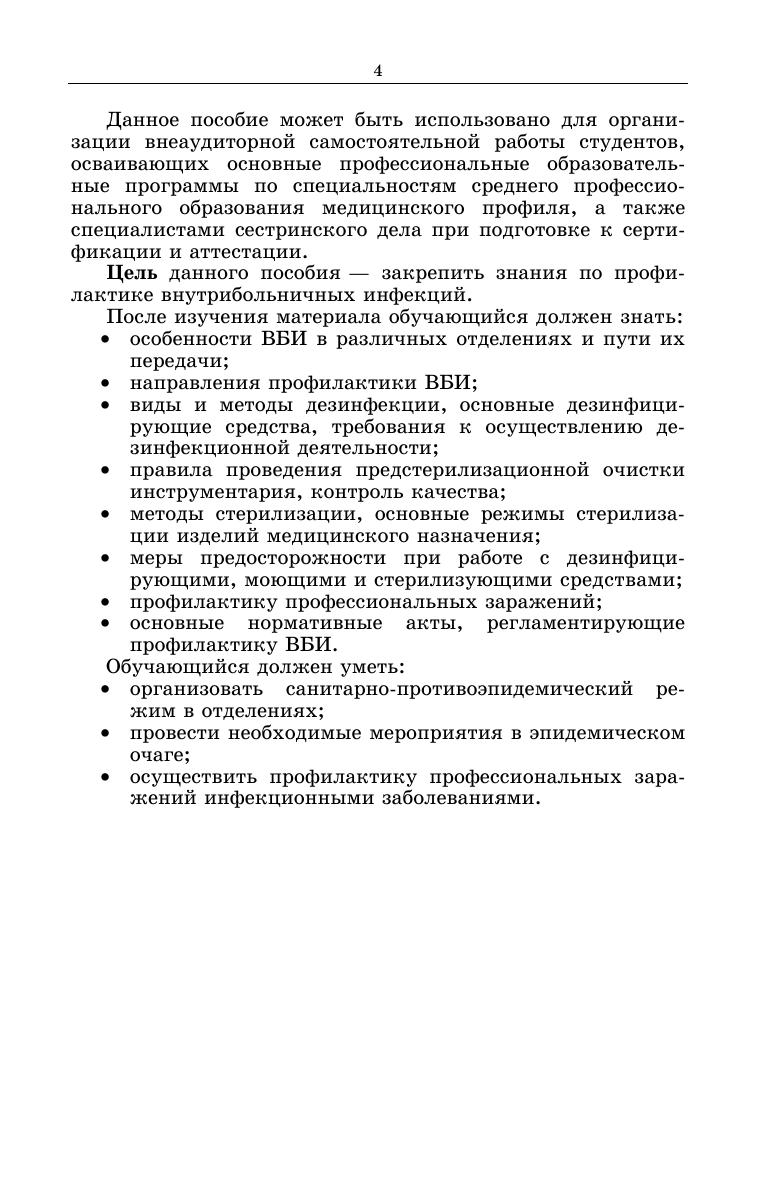 Пособие составлено на основании действующих нормативно-правовых документов, регламентирующих проведение профилактики внутрибольничных инфекций в учреждениях здравоохранения. В пособии представлены общие вопросы инфектологии — понятия инфекционного процесса, эпидемиологического процесса, основные сведения по инфекционным заболеваниям, являющиеся наиболее частой причиной профессиональной заболеваемости. В конце пособия имеются материалы для самоконтроля знаний по санитарно-противоэпидемическому режиму. Соответствует современным требованиям Федерального государственного образовательного стандарта среднего профессионального образования и профессиональным квалификационным требованиям. Пособие предназначено для студентов и преподавателей профессиональных образовательных учреждений, медицинских работников учреждений здравоохранения, в том числе осваивающих дополнительные образовательные программы по укрупненным группам специальностей: «Клиническая медицина», «Науки о здоровье и профилактическая медицина», «Сестринское дело».