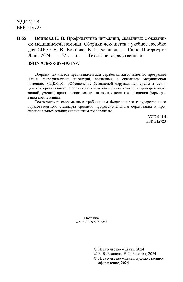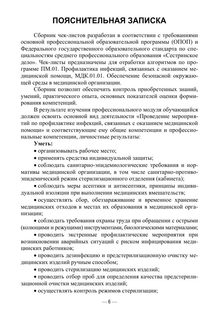 Сборник чек-листов предназначен для отработки алгоритмов по программе ПМ.01 «Профилактика инфекций, связанных с оказанием медицинской помощи», МДК.01.01 «Обеспечение безопасной окружающей среды в медицинской организации». Сборник позволит обеспечить контроль приобретенных знаний, умений, практического опыта, основных показателей оценки формирования компетенций. Соответствует современным требованиям Федерального государственного образовательного стандарта среднего профессионального образования и профессиональным квалификационным требованиям.