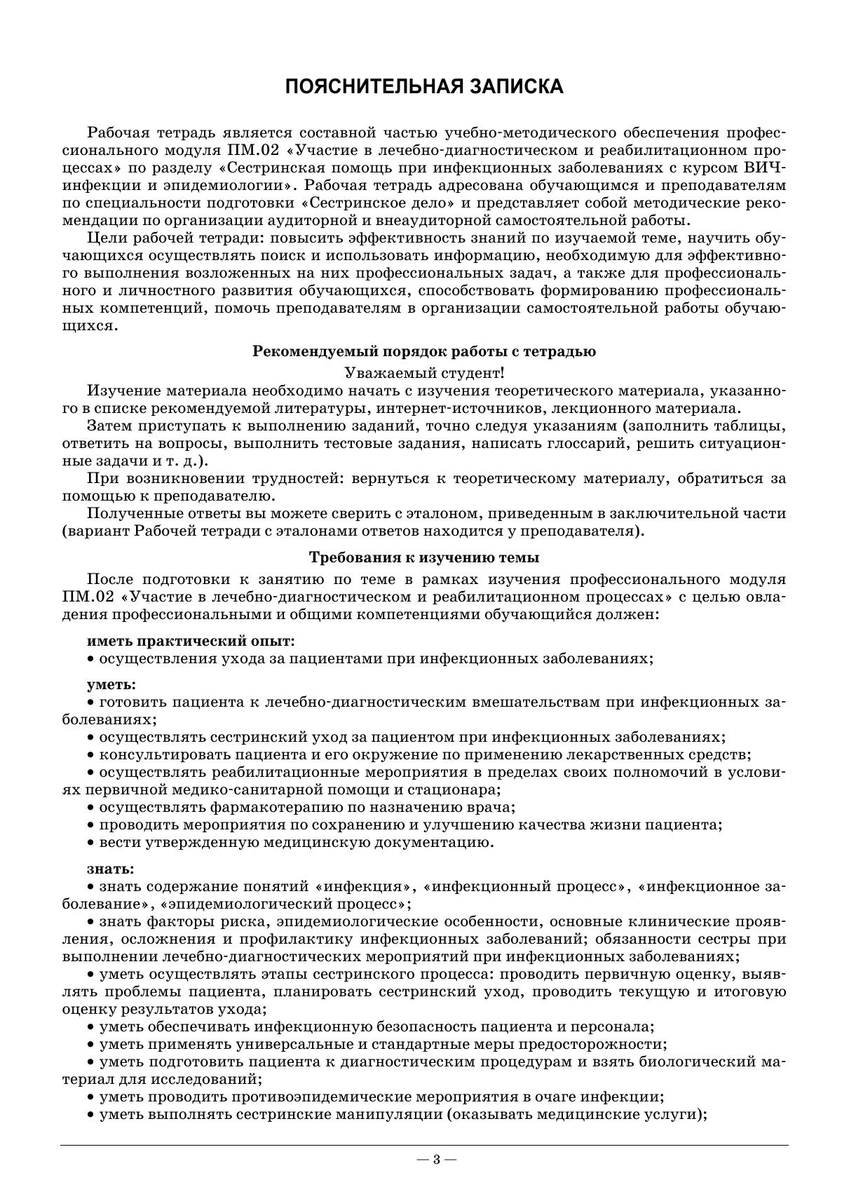 Рабочая тетрадь по разделу «Сестринская помощь при инфекционных заболеваниях с курсом ВИЧ-инфекции и эпидемиологии», являющемуся составной частью учебно-методического комплекса профессионального модуля ПМ.02 Участие в лечебно-диагностическом и реабилитационном процессах.